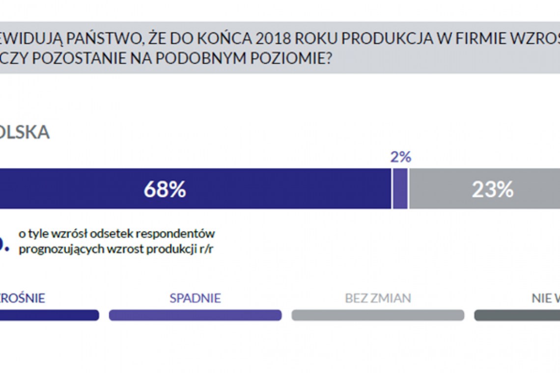 Po zeszłorocznym spadku nastrojów nie ma już śladu, a przedstawiciele motobranży w Polsce znów wykazują spory optymizm produkcyjny. Podobnie jak przed dwoma laty, aż 68% zapytanych liczy na zwiększenie poziomu zamówień. Jest to wynik o 32 p.p. lepszy niż w 2017 r. Warto zauważyć, że zaledwie 2% producentów motoryzacyjnych uważa, że do końca 2018 r. wolumen wytwarzanych przez nich towarów spadnie. Natomiast co czwarty ankietowany nie spodziewa się w tym względzie zmian.