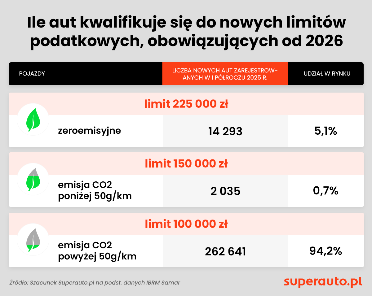 Jak dużą część rynku dotkną zmian? Eksperci Superauto.pl sprawdzili to na podstawie danych o rejestracjach nowych aut w I półroczu 2025 r. Samochody osobowe, które zostaną objęte nowym limitem 100 tys. zł stanowią aż 94,2% zarejestrowanych w tym okresie pojazdów. Z obecnego limitu, tj. 150 tys. zł, mogliby skorzystać nabywcy lub leasingobiorcy zaledwie 0,7% nowych aut. W I półroczu zarejestrowano bowiem jedynie 2 035 emitujących poniżej 50 g/km CO2.