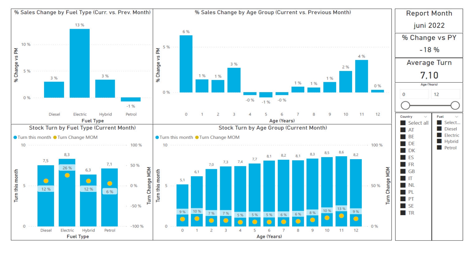 Jedynymi krajami, w których nie odnotowano spadku sprzedaży w ujęciu rok do roku, są Dania i Francja, które są również jedynymi, w których dostępność aut wzrosła miesiąc do miesiąca. Kraje, w których spadek sprzedaży rok do roku był relatywnie mały, takie jak Wielka Brytania, Holandia i Turcja, mają jednocześnie relatywnie dobrą dostępność aut w porównaniu do początku lipca 2021 roku.