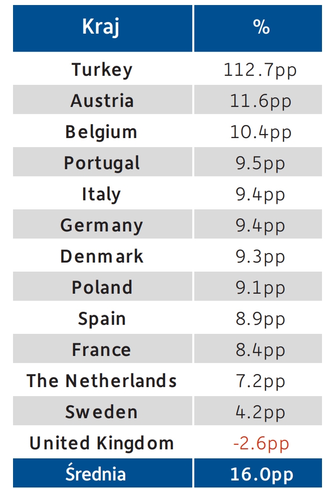 W ciągu miesiąca ceny ponownie gwałtownie wzrosły w Turcji (+40,6 punktu procentowego), a w pozostałej części regionu w tym samym okresie odnotowano średni wzrost o 1,0 punkt procentowy. Od końca ubiegłego roku ceny w Wielkiej Brytanii są obecnie niższe o 2,6 punktu procentowego, w Turcji o 112,7 punktu procentowego wyższe w tym samym okresie, a w pozostałej części regionu średnie ceny są obecnie o 8,9 punktu procentowego wyższe niż pod koniec 2021 roku.
