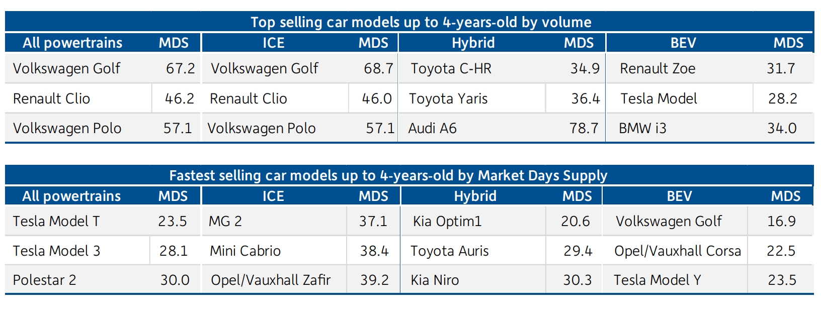 • Najszybciej sprzedające się samochody używane w wieku poniżej 4 lat w kwietniu według wskaźnika MDS to wyłącznie samochody elektryczne – Tesla utrzymała dwa pierwsze miejsca, a Model Y pozostał na szczycie. Polestar 2 wyprzedził Kia Niro, zajmując trzecie miejsce z MDS wynoszącym 30,0 dni.