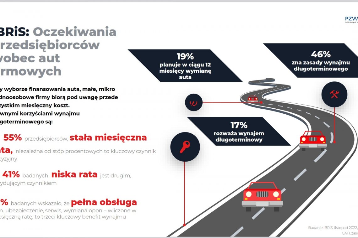 Z wyników badania „Formy finansowania samochodów w firmach” przeprowadzonego przez IBRiS wynika, że najmniejsi przedsiębiorcy przede wszystkim zwracają uwagę na miesięczne koszty związane z samochodem. Tym samym oczekują formy finansowania, która nie tylko zapewni im możliwość zaplanowania wszystkich kosztów związanych z utrzymaniem auta, ale także ustabilizuje ich budżet. Takie możliwości daje im wynajem długoterminowy, który dzięki niezmiennej, stałej racie, niezależnej od stóp procentowych, uwzględniającej zryczałtowane koszty eksploatacji samochodu takie jak np. serwis, naprawy, opony,  pozwala precyzyjnie zaplanować wszystkie wydatki związane z pojazdem służbowym. Ten czynnik został wskazany przez 55%[2] respondentów badania. Widzimy, że wynajem długoterminowy staje się coraz bardziej popularny właśnie ze względu na zapewnienie stabilności finansowej i przewidywalności kosztów. Z danych PZWLP wynika, że w 2022 roku po wynajem długoterminowy sięgało już blisko 3 na 10 przedsiębiorców w Polsce, nabywających w tym czasie nowe auta – komentuje Robert Antczak, Prezes Zarządu Polskiego Związku Wynajmu i Leasingu Pojazdów (PZWLP).