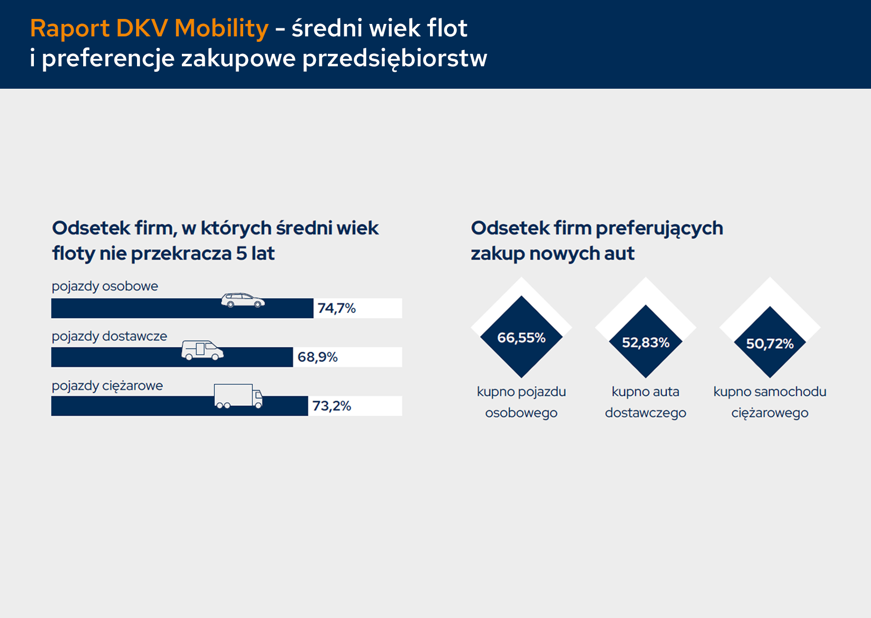 Floty użytkowane przez firmy transportowe w Polsce są stosunkowo młode, a ich średni wiek nie przekracza 5 lat. W przypadku pojazdów osobowych jest to aż 74,7% flot, lekkich pojazdów dostawczych – 68,9%, a ciężarowych – 73,2%.