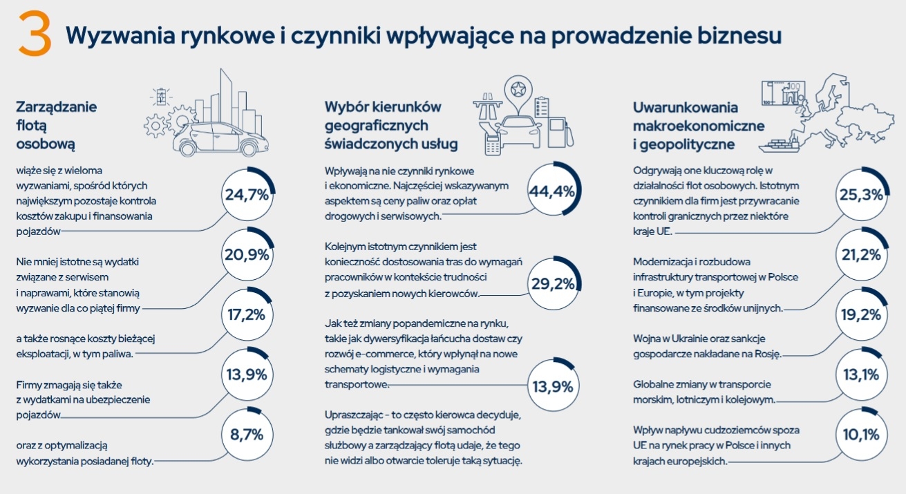 W przypadku firm z flotami pojazdów dostawczych, 24,9% z nich wskazuje na kontrolę kosztów serwisu i utrzymania pojazdów jako największe wyzwanie, a 19,5% na koszty zakupu i finansowania floty.