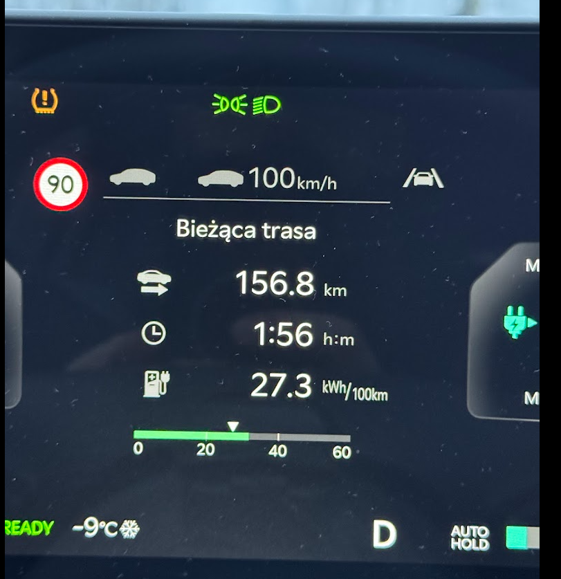 Trasa 156,8 km (40 km miasto plus S-ka w stronę Gdańska), czas 1 h 56 min, temperatura –10°C. Średnie zużycie: 27,3 kWh/100 km. Dokładnie tak, jak powinno być.