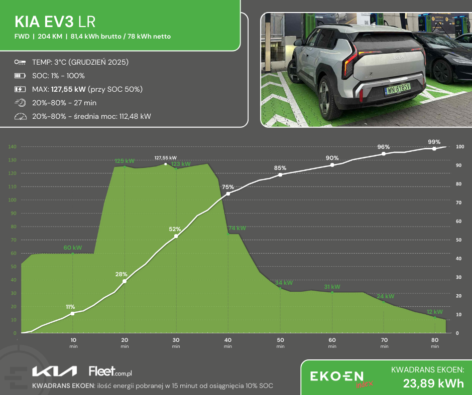 Praktyczny „elektryk” to zasięg i prędkość ładowania. EV3 gra tutaj na remis. Punkt dla Kia za pojemność baterii, o której wspomniałem w poprzednim akapicie, ale piłka po stronie nieprzekonanych za czas ładowania. Niewiele mi zabrakło do katalogowych okolic 127 kW mocy ładowania prądem stałym DC (125.8 kW to wartość maksymalna uzyskana w temperaturze -2 stopni Celsjusza), ale w 2026 roku, w tej klasie to wynik, który nie powala i co gorsze z pewnością odbierze Fleet Managerowi argument o szybkim i sprawnym ładowaniu w trasie.