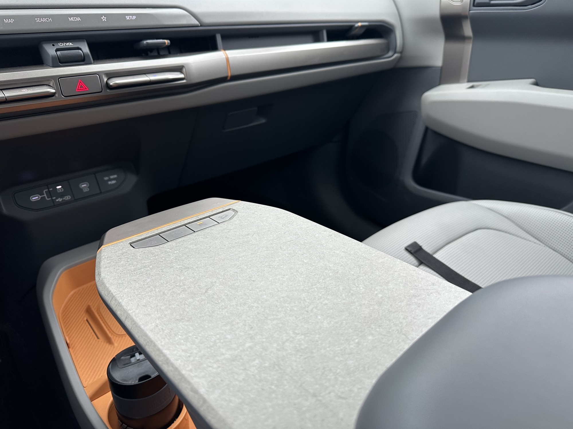 Z perspektywy użytkownika flotowego auto zaoferowało ciekawe udogodnienia jak spora ilość portów USB-C (ukryte również w oparciu siedzeń pierwszego rzędu), gniazdo 230 V w miejscu, gdzie w autach spalinowych zazwyczaj mamy tunel w drugim rzędzie siedzeń i osobisty game-changer – podłokietnik z przodu, który w kilka chwil może stać się stołem na szybki lunch w trasie lub mobilnym biurkiem, na którym z powodzeniem umieścimy służbowy komputer czy tablet i wykorzystamy aktywnie czas podczas postoju, czy ładowania.