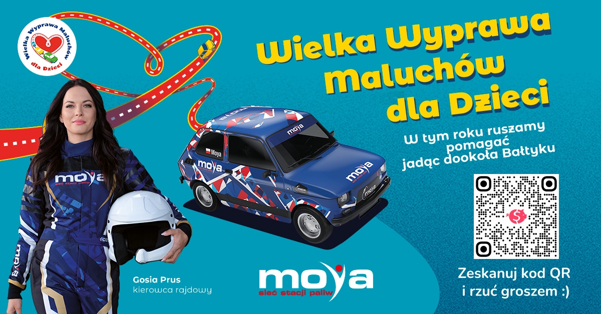 W barwach MOYA wystartuje wyjątkowy Fiat 126p, specjalnie zakupiony, oklejony i przygotowany do pokonania długiej trasy, będzie jednym z 98 „Maluchów” biorących udział w wydarzeniu. Za jego kierownicą zasiądą m.in. członkowie zarządu Anwim S.A., kierowca rajdowy Gosia Prus oraz influencerzy i przedstawiciele stacji MOYA z Bytowa. To zespół złożony z osób, dla których motoryzacja i społeczne zaangażowanie idą w parze. Wspólna podróż będzie nie tylko ciekawą przygodą, ale przede wszystkim symbolem solidarności z dziećmi, które potrzebują realnego wsparcia.