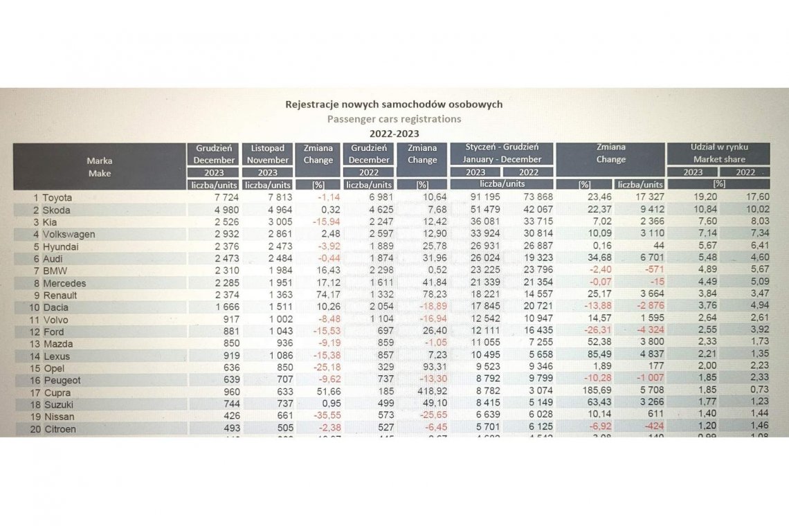 Polski rynek nowych samochodów osobowych wzrósł w roku ubiegłym o ponad 13%. W samym grudniu wyniki były zbliżone do rezultatu zanotowanego w grudniu 2022 roku.