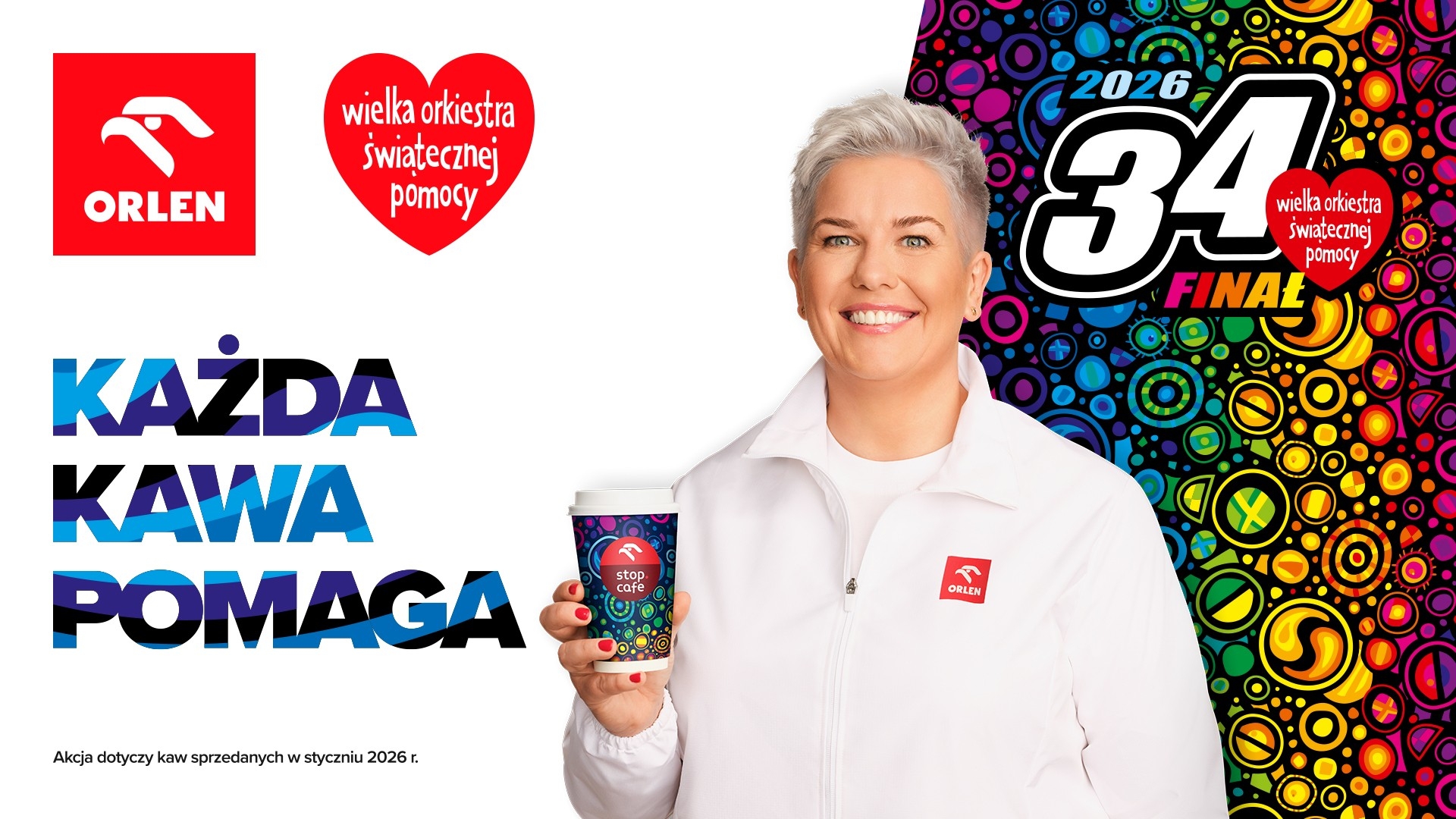 W styczniu, kupując kawę na stacji ORLEN, wspierasz 34. Finał Wielkiej Orkiestry Świątecznej Pomocy, który w tym roku gra na rzecz gastroenterologii dziecięcej w Polsce. Z każdej sprzedanej kawy ORLEN przekaże 1 zł na zakup nowoczesnego sprzętu diagnostycznego dla placówek medycznych w całym kraju. Akcja trwa do 31 stycznia 2026 roku – to prosty gest, który realnie pomaga najmłodszym pacjentom.