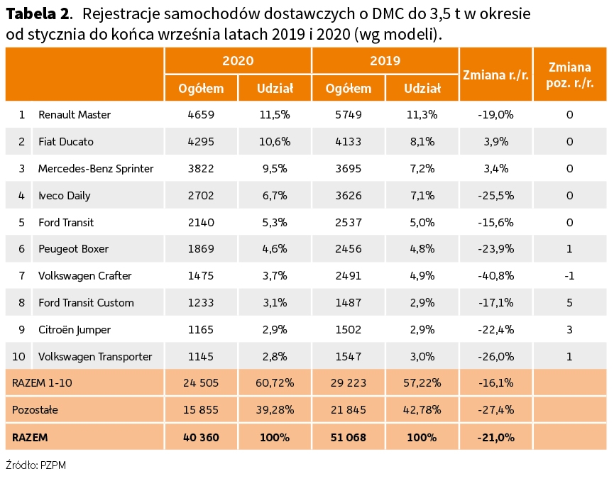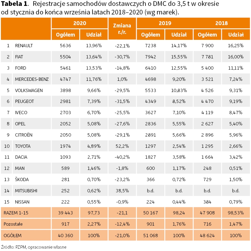 We wrześniu 2020 br. w rankingu samochodów dostawczych liderem był Fiat z wynikiem 845 szt. Zyskał jedną pozycję w porównaniu do sytuacji sprzed roku (+35,9%). Drugi był Renault z wynikiem 789 szt. (+40,4%). Trzecia była marka Mercedes-Benz (725 szt. +48,5%). Znaczący przyrost zanotował też piąty Volkswagen – 531 (+71,3%). Ogromne przyrosty rejestracji w sierpniu i we wrześniu nie poprawiły łącznego obrazu trzech kwartałów 2020 roku. Od początku 2020 roku zarejestrowano 40 360 nowych samochodów dostawczych do 3,5 t, co jest wynikiem niższym niż w okresie styczeń–wrzesień 2019 roku o 21%.
