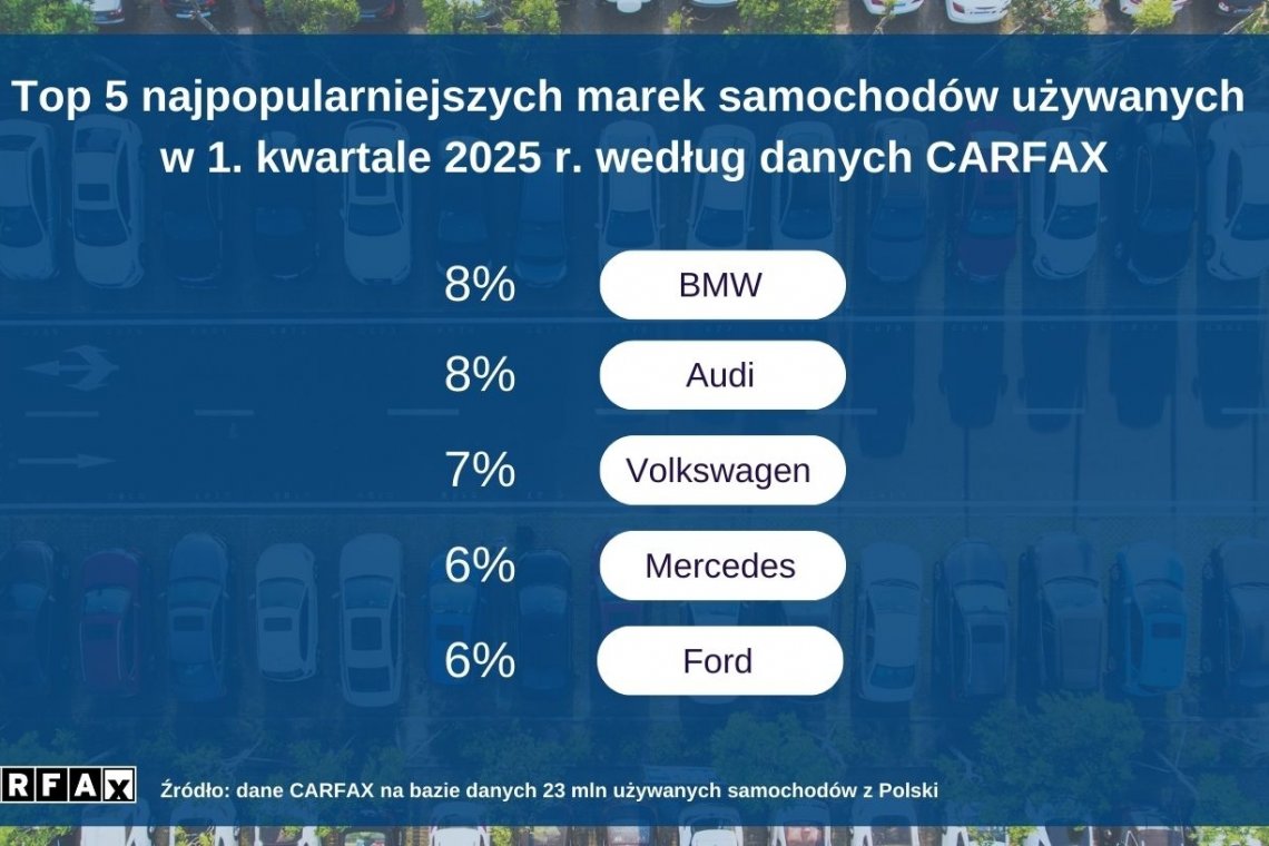 W pierwszym kwartale 2025 r. najwięcej aut używanych w Polsce to BMW (8 proc., średnio 12 lat i 177 tys. km przebiegu) i Audi (8 proc., średnio 11 lat i 186 tys. km przebiegu). Kolejne miejsce zajmują Volkswagen (7 proc., średnio 12 lat i 186 tys. km przebiegu), następnie Mercedes (6 proc., średnio 13 lat i 170 tys. km przebiegu) i Ford (6 proc., średnio 10 lat i 159 tys. km przebiegu).