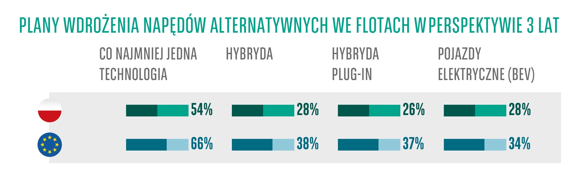 Jak wskazują wyniki badania przeprowadzonego przez Arval Mobility Observatory, zawirowania geopolityczne i gospodarcze, podobnie jak wcześniej pandemia, nie są w stanie powstrzymać rozwoju elektromobilności. Czysto elektryczne samochody osobowe we flotach ma już 13% polskich firm, a 28% chce je mieć w perspektywie trzech lat. Inne ekologiczne napędy również są popularne. Z pojazdów zelektryfikowanych (hybrydy, plug-in i auta czysto elektryczne) korzysta już co trzecia firma, a 54% planuje uzupełnienie o nie swoich flot w perspektywie trzech lat.