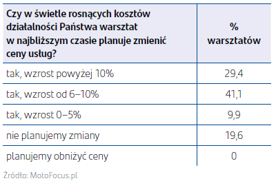 Także ponad połowa ankietowanych warsztatów zanotowała wzrost przychodów rok do roku. Widoczne jest, że liczba warsztatów deklarujących większe przychody i wzrost klientów jest podobna. Trudno jednak wywnioskować, w jakim stopniu na przychody wpływa liczba klientów, a na ile wynika to ze wzrostu cen usług. Niestety, warto zauważyć, że razem z rosnącą liczbą zleceń i klientów rosną też koszty, które skutecznie pomniejszają osiągane zyski. Zdecydowana większość warsztatów planuje więc w najbliższym czasie podnieść ceny usług, a ponad 70% zamierza je podnieść o ponad 5%.