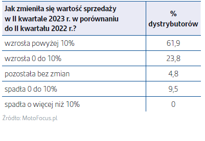W II kwartale tego roku dystrybutorzy po raz kolejny zanotowali imponujące wyniki. Blisko dwie trzecie ankietowanych osiągnęło wzrost sprzedaży powyżej 10% rok do roku. Spadki zanotowało mniej niż 10% i były to spadki jednocyfrowe. Należy zauważyć, że zanotowane wzrosty były znacząco wyższe od prognoz z poprzedniego kwartału. Obecnie ponad 85% firm zwiększyła sprzedaż, wtedy 66% ankietowanych spodziewało się wzrostów.