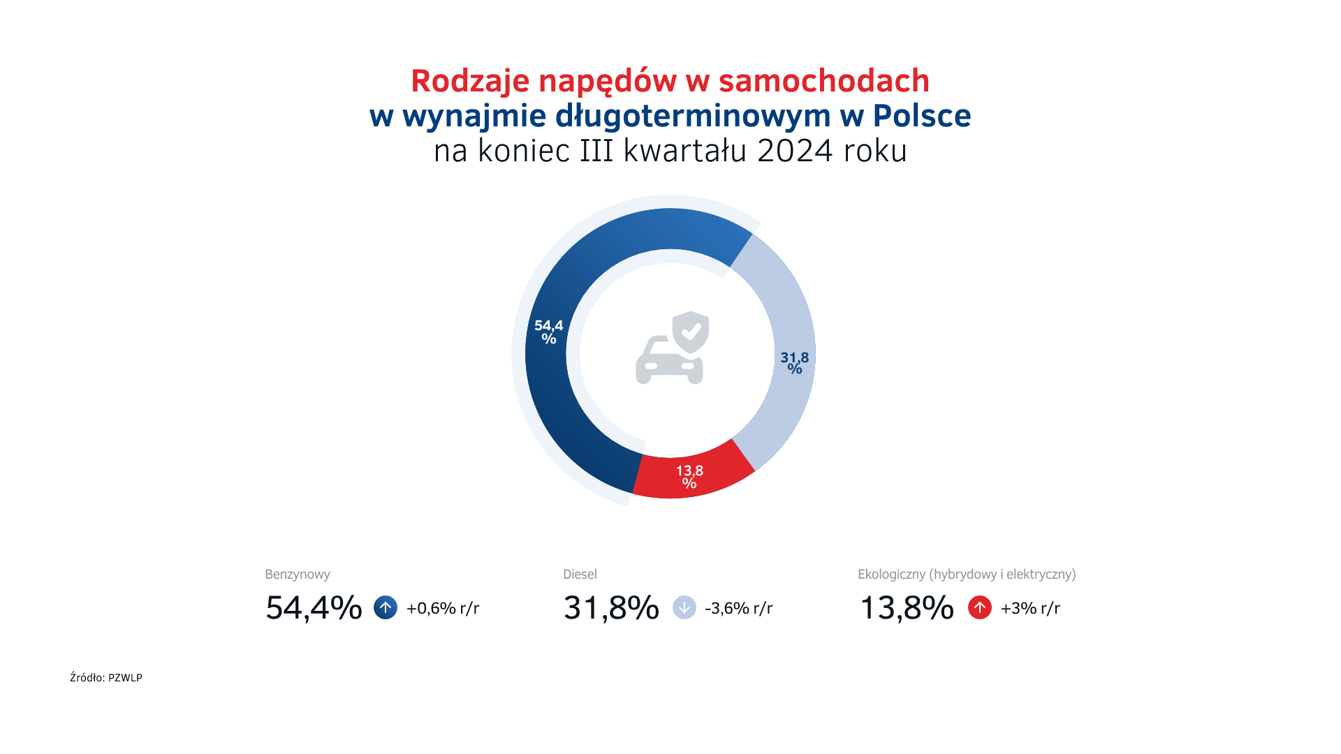 Zdecydowanie najszybciej zwiększa się udział aut wyposażonych w napędy ekologiczne, zelektryfikowane, a więc wszelkiego rodzaju hybryd i samochodów w pełni elektrycznych. Pojazdy tego typu stanowiły w wynajmie długoterminowym w Polsce 13,8% łącznej floty, co oznacza wzrost na przestrzeni roku o 3 p.p.