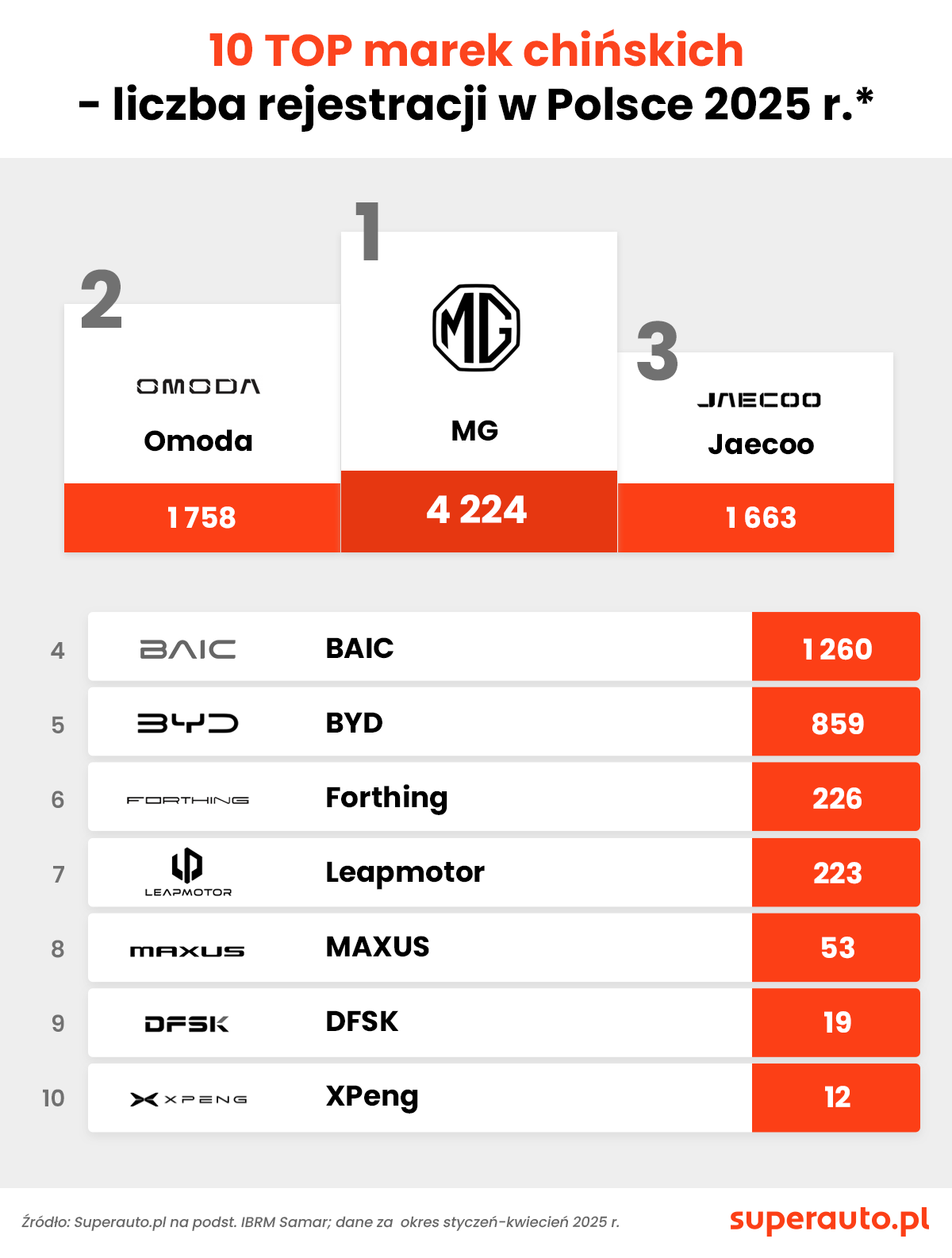 Najbliżej tego celu jest MG – chiński producent z brytyjskim rodowodem - który w kwietniu znalazł się na pozycji 13. (1 175 zarejestrowanych pojazdów), a licząc od początku roku – na miejscu 15. (4 224 auta). Wejście do pierwszej dziesiątki wymagałoby przegonienia takich graczy, jak: Ford, Volvo, Dacia, Lexus oraz Nissan. Nie jest to niewykonalne, patrząc na tempo, w jakim MG zwiększa swoje udziały w rynku, choć wciąż wydaje się dość abstrakcyjne. TOP 10 najczęściej rejestrowanych aut zamyka, wg danych za cztery pierwsze miesiące br., Ford z liczbą ponad 8,5 tys. zarejestrowanych samochodów.