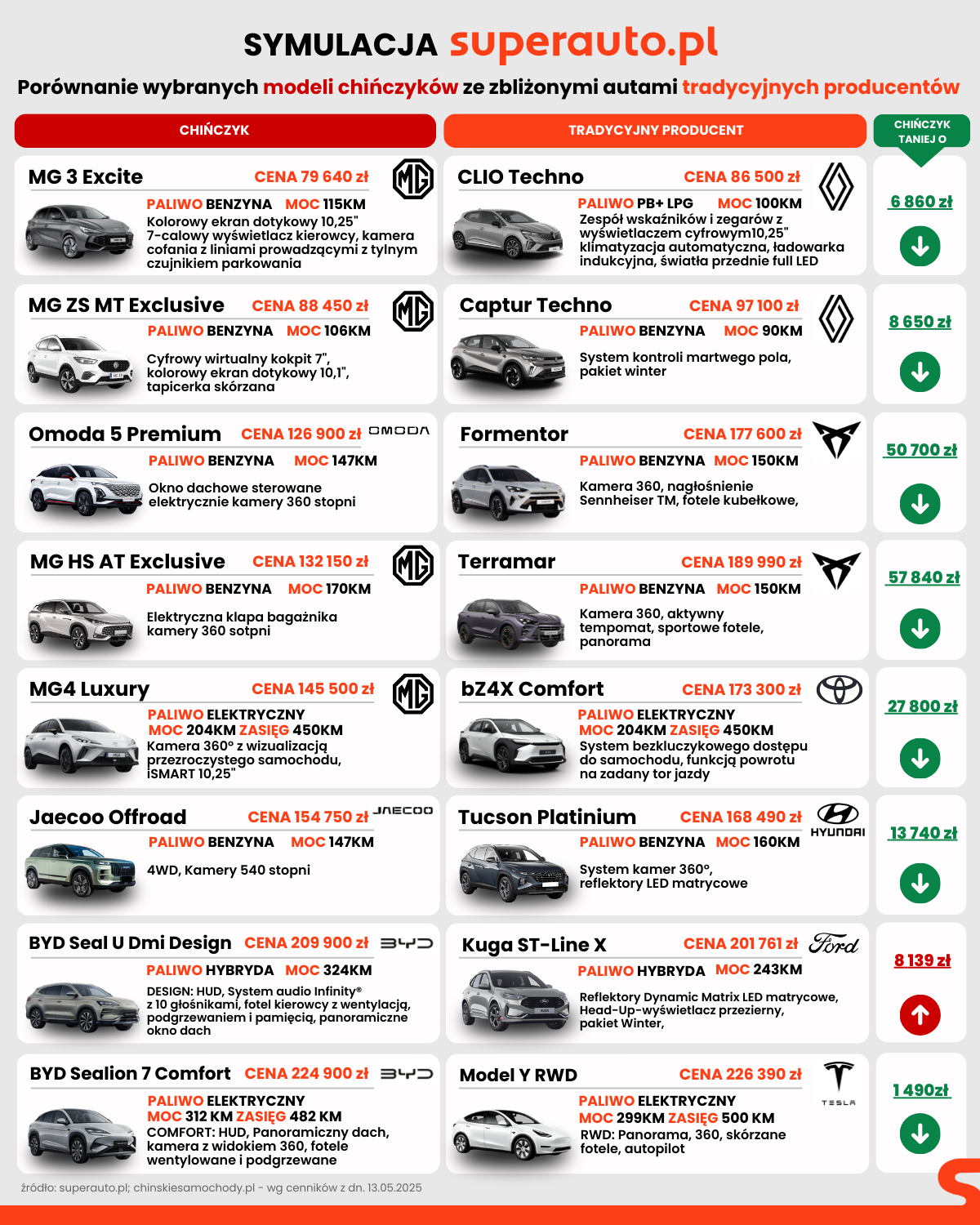 Ponieważ na rynku motoryzacyjnym popularna jest teza, że marki chińskie oferują niższą cenę za zbliżone parametry techniczne oraz wyposażenie względem aut sprzedawanych przez tradycyjnych producentów (z Europy, Korei, Japonii czy USA), eksperci Superauto.pl sprawdzili, jak wygląda to na konkretnych przykładach samochodów. – Wiedzieliśmy, że na poziomie średnich cen rynkowych, marki chińskie są bardziej konkurencyjne, natomiast chcieliśmy tę tezę zweryfikować na konkretnych pojazdach, bo nabywca porównuje przecież 2-3 podobne modele, a nie cały rynek – wyjaśnia Oskar Jedliński, dyrektor działu rozwoju rynku w Superauto,pl. - Sparowaliśmy osiem modeli chińczyków z autami należącymi do tego samego segmentu i możliwie zbliżonymi do samochodów chińskich pod względem stylistyki, mocy, a także poziomu wyposażenia. Siedem z nich okazało się tańszych od swoich tradycyjnych odpowiedników, a jeden – droższy – informuje Oskar Jedliński.