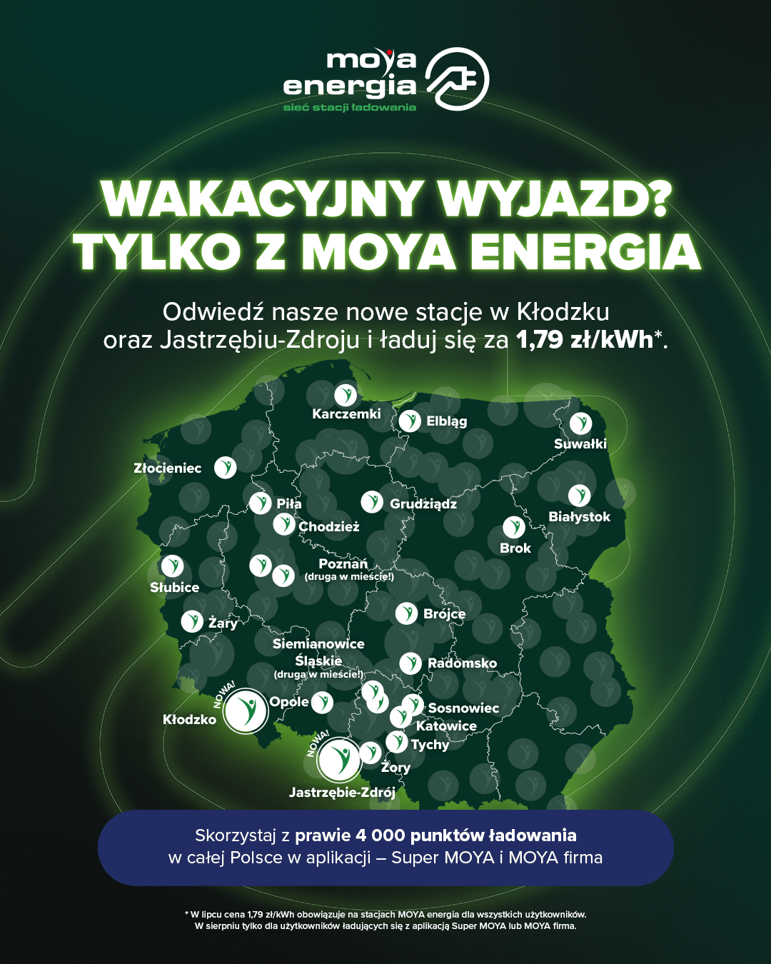 * Promocja 1,79 zł/kWh obowiązuje na stacjach MOYA energia od 1 lipca 2025 dla wszystkich, od 1 sierpnia do 31 sierpnia tylko dla użytkowników Super MOYA i MOYA firma. Najniższa cena sprzed 30 dni przed wprowadzeniem promocji wynosiła 1,99 zł/kWh.