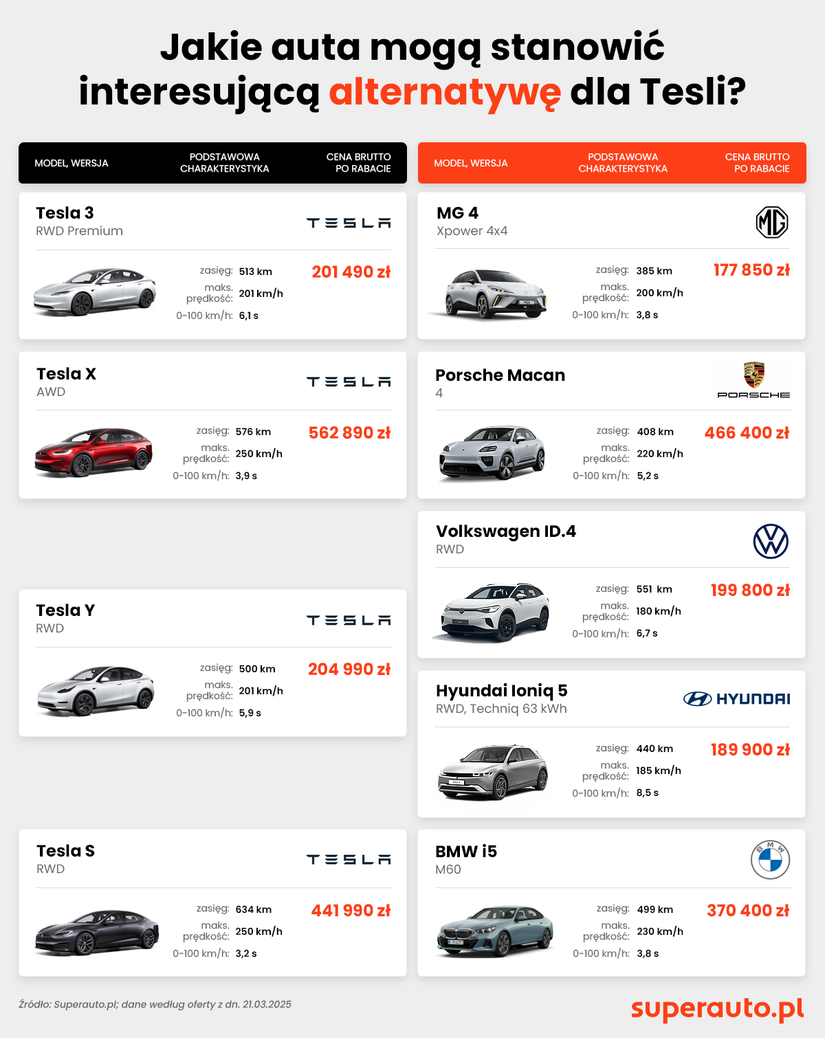 Analitycy Superauto.pl wytypowali samochody, które mogą dziś stanowić atrakcyjną alternatywę dla poszczególnych modeli Tesli (w analizie nie uwzględniono Cybertrucka). Lista zawiera podpowiedzi dla osób, które chciałyby kupić elektryka, ale czy to z powodu sprzeciwu wobec działalności politycznej E. Muska, czy to ze względu na cenę szukają innych opcji niż Tesla.