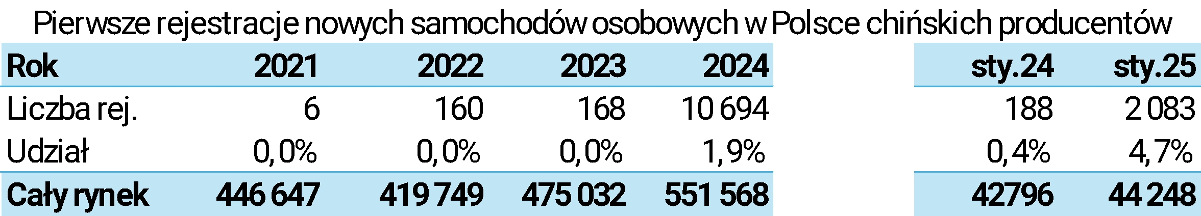 Zeszły rok upłynął pod znakiem co raz większej ilości dostępnych modeli samochodów produkowanych w Chinach. Wyniki z roku 2024 wskazywały na dalszy rozwój tych producentów, ale znowu zmiany polityczne w USA i nałożenie ceł przez UE w wysokości od 7% do nawet 35% mogły wskazywać na spowolnienie. Jak będzie ostatecznie to pokażą nam wyniki na koniec 2025 roku. Natomiast patrząc na pierwsze miesiące 2025 roku można wskazywać na dalszy dynamiczny wzrost, gdyż sam styczeń 2025 był o 1008% lepszy od stycznia w 2024 roku. Dodając do tego, że w 2024 roku rynek takich samochodów wzrósł 62,5 razy w stosunku do 2023 roku, można bardziej wskazywać na wzrost udziału takich producentów w rynku.