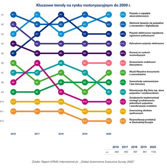 Po raz pierwszy w historii, respondenci badania KPMG są zdania, że do 2030 r. największa część pojazdów nie będzie już napędzana przez silniki spalinowe. Najważniejszymi trendami w branży wskazującymi kierunki rozwoju rynku motoryzacyjnego są obecnie pojazdy o napędzie akumulatorowym, zdolność łączenia się pojazdów z otoczeniem i digitalizacja, pojazdy elektryczne napędzane ogniwami paliwowymi i hybrydowe pojazdy elektryczne. Zdaniem przedstawicieli kadry menedżerskiej z firm motoryzacyjnych globalna pandemia prowadzi do powstania wyraźnie różnych rynków motoryzacyjnych. Kończy się tradycyjny światowy rynek samochodów osobowych, a sytuacja spowodowana pandemią COVID-19 znacznie przyspieszy ten proces. Według prognoz KPMG w trzecim kwartale tego roku produkcja i sprzedaż pojazdów na całym świecie ponownie wzrośnie.