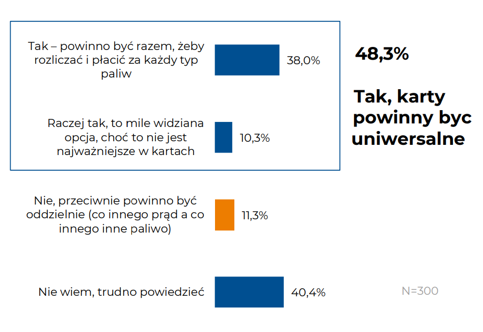 Badanie klientów flotowych pokazuje, że jeśli karta miałaby być narzędziem zredukowanym do opłat za paliwo – to może nie wystarczyć. Już dziś klienci zgłaszają postulat – karta przyszłości to karta uniwersalna, czyli też taka, którą zapłacimy za ładowany prąd. Niemal co drugi klient wyraża takie przekonanie, mimo że aut na prąd jest jeszcze we flotach niewiele. Mimo że cały rynek samochodów elektrycznych jest w Polsce w początkowej fazie rozwoju, to badani widzą potrzebę rozwoju tego narzędzia, jakim jest multifunkcyjna karta. Z tego punktu widzenia (czyli przy tam niskim udziale samochodów elektrycznych) oczekiwanie, że karta będzie służyć także do płacenia za prąd oznacza dla emitentów, że taka możliwość z dużym prawdopodobieństwem może stać się szybko drugim najważniejszym – po zasięgu – kryterium wyboru dostawcy.