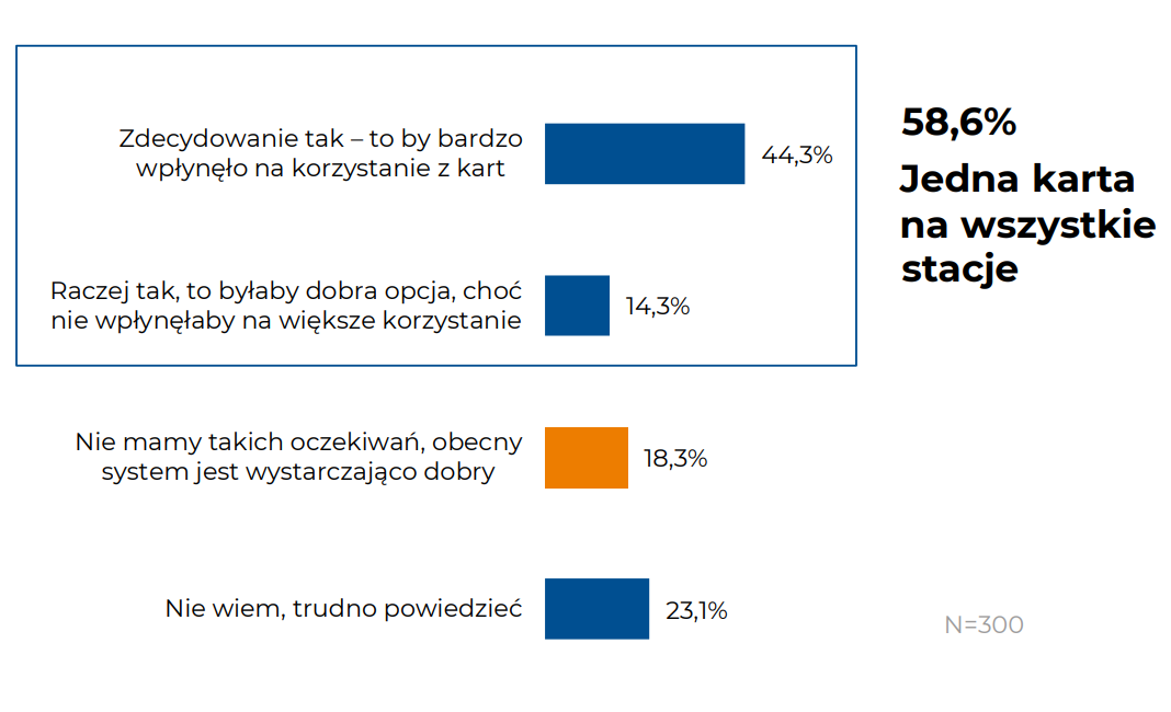 W ocenie ponad 14% badanych akceptowanie kart przez różne sieci (czyli też różnych emitentów) to dobry pomysł, choć nie są aż tak przekonani, czy taki wariant spowoduje większe korzystanie. Tę opinię podzielają przede wszystkim przedsiębiorcy z flotą 21–50 pojazdów. Co piąta firma flotowa deklaruje, że nie ma takich oczekiwań i obecny system uznaje za wystarczająco dobry.