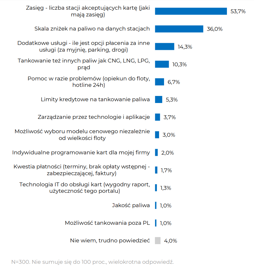 Liczba stacji akceptujących kartę i możliwa do uzyskania skala zniżek na paliwo to najważniejsze kryteria wyboru karty paliwowej dla firm flotowych. Zasięg, czyli liczba stacji, na których zapłacimy kartą – to kluczowy element analizowany przy wyborze emitenta, a już zwłaszcza ważny dla klientów z największą flotą, czyli 51 i więcej pojazdów oraz zatrudniających co najmniej 50 pracowników. Na skalę zniżek na paliwo zwraca uwagę 36% firm flotowych i są to przede wszystkim klienci finansujący służbową flotę wyłącznie z własnych środków. Możliwość płacenia kartą paliwową za inne usługi to istotne kryterium wyboru dla firm z flotą 21–50 pojazdów. Dodatkowo ważne przy wyborze dla 5,3% badanych są limity kredytowe na tankowanie paliwa. Jest to aspekt analizowany zwłaszcza przez firmy finansujące flotę zewnętrznymi środkami (leasing, kredyt), szczególnie firmy średnie, o rozmiarze od 10 do 49 osób. (wykres 6.)