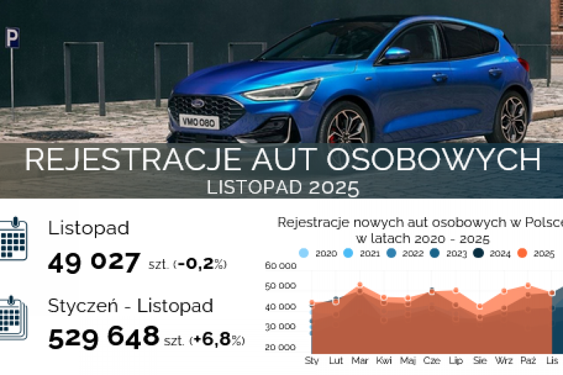 Jeśli pod uwagę weźmiemy wyłącznie auta osobowe dane Centralnej Ewidencji Pojazdów i Kierowców wskazują, że w listopadzie 2025 r. zarejestrowano w Polsce 49 027 samochodów osobowych, o 0,25% (-121 szt.) mniej niż rok wcześniej i o 7,02% (-3 703 szt.) mniej niż w październiku br.