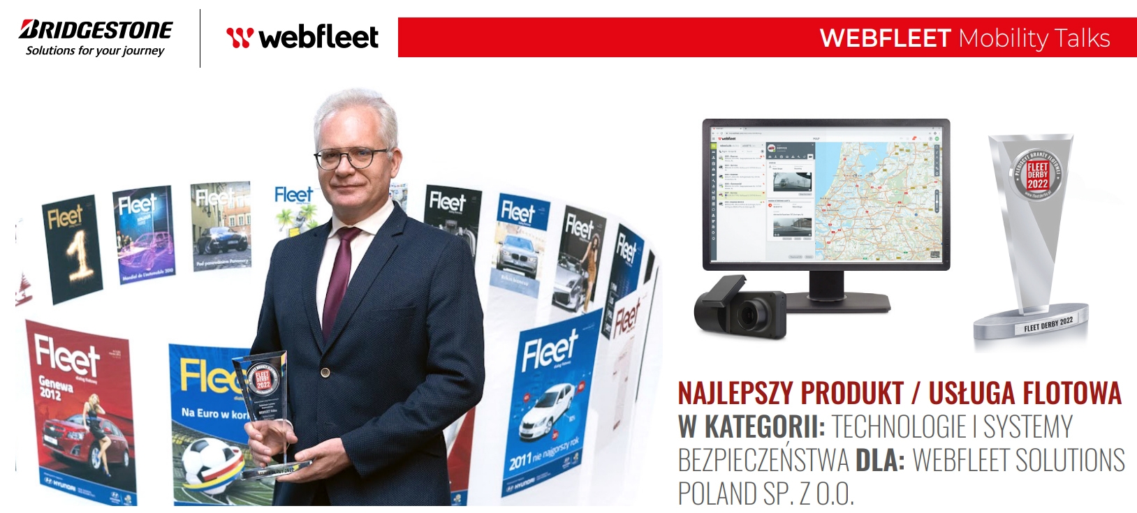 Firm flotowych nie stać na przedłużające się przestoje spowodowane zdarzeniem na drodze z udziałem pojazdu ich floty, kosztowne naprawy – często na terenie innych państw oraz płacenie niezasadnych należności firmom ubezpieczeniowym. Wszystkie elementy można zminimalizować i oszczędzić w ten sposób znaczne pieniądze. Odpowiedzią na te wyzwania jest system Webfleet Video, czyli zintegrowane rozwiązanie telematyczne, które łączy nagrania zdarzeń drogowych z kamery samochodowej z danymi pojazdu. Nasze rozwiązanie jest wspierane przez kamerę CAM 50, która wykorzystuje sztuczną inteligencję (AI) do identyfikacji zagrożeń i zmniejszania liczby wypadków, pomagając przewoźnikom unikać niebezpiecznych i kosztownych sytuacji. Ma to wpływ nie tylko na bezpieczeństwo kierowców, ale również na sukces firmy transportowej. Tym bardziej cieszy nas fakt, że firmy i użytkownicy rozwiązań flotowych zauważyli i docenili rozwiązanie Webfleet Video w tegorocznej edycji plebiscytu Fleet Derby. Nasze rozwiązanie zwyciężyło w kategorii produkt/usługa flotowa: Technologia i systemy bezpieczeństwa. To dla nas nie tylko prestiżowe wyróżnienie, ale także wskazanie znaczenia i potrzeby nowych technologii w zapewnieniu bezpieczeństwa i optymalizacji kosztów.