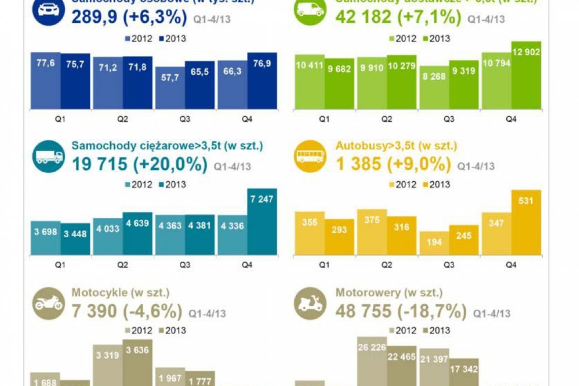 pzpm2013W 2013 roku produkcja sprzedana polskiego przemysłu motoryzacyjnego osiągnęła wartość 109,2 mld zł. To nominalnie o 6,3% więcej niż w 2012 roku. Za wzrost odpowiada produkcja samochodów użytkowych oraz części i akcesoriów motoryzacyjnych. Wzrost odnotował także polski rynek pojazdów samochodowych. Do 289,9 tys. sztuk (o 6,3% r/r) zwiększyła się liczba rejestracji nowych samochodów osobowych. Rejestracje samochodów użytkowych wzrosły w jeszcze większym stopniu, do czego przyczyniło się nadchodzące wdrożenie normy EURO VI. Takie wnioski płyną z pierwszego z serii raportów kwartalnych Polskiego Związku Przemysłu Motoryzacyjnego oraz firmy audytorsko-doradczej KPMG w Polsce, podsumowującego wyniki rynku i przemysłu motoryzacyjnego, a także motoryzacyjnych usług finansowych w 2013 roku.Rynek motoryzacyjnyOtoczenie rynkowe polepsza się, jednak sytuacja gospodarcza wciąż nie sprzyja sprzedaży pojazdówPo słabej I połowie 2013 roku, kiedy wzrost gospodarczy wyhamował niemal do zera, w II połowie roku nastąpiło pewne odbicie. W III kwartale polski PKB wzrósł o 1,9% r/r (rok do roku), zaś w IV kwartale szacunkowo o 2,7%. Poprawa sytuacji gospodarczej wpłynęła na nastroje przedsiębiorstw oraz konsumentów indywidualnych, które stopniowo poprawiały się przez cały 2013 rok. Wskaźniki koniunktury w obu sektorach nabywców są jednak wciąż negatywne, co przekłada się na niską skłonność do ponoszenia istotnych wydatków inwestycyjnych – w tym na środki transportu. Ożywienie popytu na pojazdy wymaga jednak silniejszych bodźców ekonomicznych – mówi Mirosław Michna, Partner w Dziale Doradztwa Podatkowego, Szef Zespołu Doradców dla Branży Motoryzacyjnej, KPMG w Polsce. Na rynek pojazdów w końcu 2013 roku wpływały także istotne zmiany o charakterze regulacyjnym. Część nabywców instytucjonalnych, którzy planowali zakup samochodów osobowych, w końcu roku wstrzymała oddech w oczekiwaniu na potencjalny powrót „kratki" i związane z nią oszczędności podatkowe. Na szczęście w skali całego rynku zakupy nabywców firmowych mimo to wzrosły. W segmencie pojazdów użytkowych nadchodzące wdrożenie normy EURO VI podbudowało sprzedaż. Związane z tym przewidywanie wzrostu cen, skłoniło przedsiębiorców do przyspieszenia zakupów w IV kwartale roku – komentuje Jakub Faryś, Prezes Polskiego Związku Przemysłu Motoryzacyjnego. Dobra II poł. 2013 roku ratuje wyniki w sprzedaży samochodów osobowychII połowa 2013 roku przyniosła wzrost rejestracji nowych samochodów osobowych o 14,9% r/r, co przełożyło się na poprawę całorocznych wyników. Ogółem w 2013 roku zarejestrowano 289,9 tys. nowych samochodów osobowych, czyli o 6,3% więcej niż w 2012 roku. Wzrost wypracowali niemal w całości nabywcy instytucjonalni, którzy w 2013 roku zwiększyli zakupy samochodów osobowych o 10,2%. Wśród nabywców indywidualnych poprawa popytu była minimalna (wzrost 1,4%). Niski popyt ze strony osób prywatnych jest jedną z największych słabości tego segmentu rynku w Polsce. W sytuacji, gdy w 2013 roku sprowadzono do Polski 712 tys. używanych samochodów osobowych, nie dziwi fakt, że osoby prywatne (w tym indywidualni przedsiębiorcy!) kupiły jedynie 121 tys. nowych pojazdów – komentuje Mirosław Michna, Partner w Dziale Doradztwa Podatkowego, Szef Zespołu Doradców dla Branży Motoryzacyjnej, KPMG w Polsce. W 2013 roku marki popularne stanowiły blisko 91% rejestracji nowych samochodów osobowych w Polsce (262,8 tys. sztuk). Liczba rejestracji w tym segmencie wzrosła o 6,1% r/r. Widoczny jest przy tym wzrost koncentracji rynku. Marki o większym udziale w rynku radzą sobie generalnie lepiej – spośród dziesięciu marek popularnych o największym wolumenie rejestracji w Polsce, osiem odnotowało minimum dziesięcioprocentowy wzrost r/r. Nieznacznie lepsze wyniki odnotowały marki premium+, których rejestracje wzrosły o 6,9% do 27,2 tys. szt. Także w tym segmencie trzy największe marki (BMW, Audi, Mercedes-Benz) odnotowały wzrosty rzędu 9-14% r/r, czyli znacznie przekraczające średnią dla rynku. Volvo zajmujące czwarte miejsce zwiększyło liczbę rejestracji o 6%. Jest to o tyle istotne, że cztery opisane marki mają 82% udziału w rejestracjach segmentu premium+.Rośnie popyt na średniej wielkości pojazdy. Największy wzrost rejestracji odnotowały - pierwsza i trzecia grupa pod względem liczebności - samochody z segmentu C (tzw. kompakty) oraz małe/średnie SUV-y i crossovery. Dynamicznie rozwijały się też mniej liczne segmenty - małe/średnie MPV i kombivany, czyli także auta średniej wielkości. Nie odnotowano wzrostu w klasie najmniejszych oraz największych aut (z wyjątkiem dużych SUV-ów i crossoverów). Istotny spadek rejestracji widać tylko w jednym segmencie rynku, tj. klasie D, czyli średnio-dużych autach rodzinnych.Znaczne ożywienie rynku samochodów użytkowych w końcu 2013 roku, brak jednak trwałych podstaw wzrostu Końcówka roku przyniosła znaczne ożywienie zakupów wszystkich typów samochodów użytkowych. W 2013 roku zarejestrowano 42,2 tys. nowych samochodów dostawczych (o DMC3,5t). W skali roku liczba rejestracji wzrosła aż o 20%, do 19,7 tys. O 9% wzrosła także liczba rejestracji nowych autobusów (DMC>3,5t). Ogółem w 2013 roku zarejestrowano ich 1,38 tys. sztuk. We wszystkich segmentach rynku samochodów użytkowych mieliśmy do czynienia ze znacznym ożywieniem popytu w IV kwartale, ponieważ przedsiębiorcy „rzucili się" na zakupy, aby zdążyć przed wejściem w życie normy EURO VI. W segmencie samochodów ciężarowych mieliśmy w IV kwartale wzrost rejestracji o 2/3 w porównaniu z poprzednim rokiem. Nie należy jednak oczekiwać utrwalenia się trendu wzrostowego w 2014 roku. Nawet biorąc pod uwagę poprawę sytuacji ekonomicznej, trudno będzie powtórzyć te wyniki – komentuje Jakub Faryś, Prezes Polskiego Związku