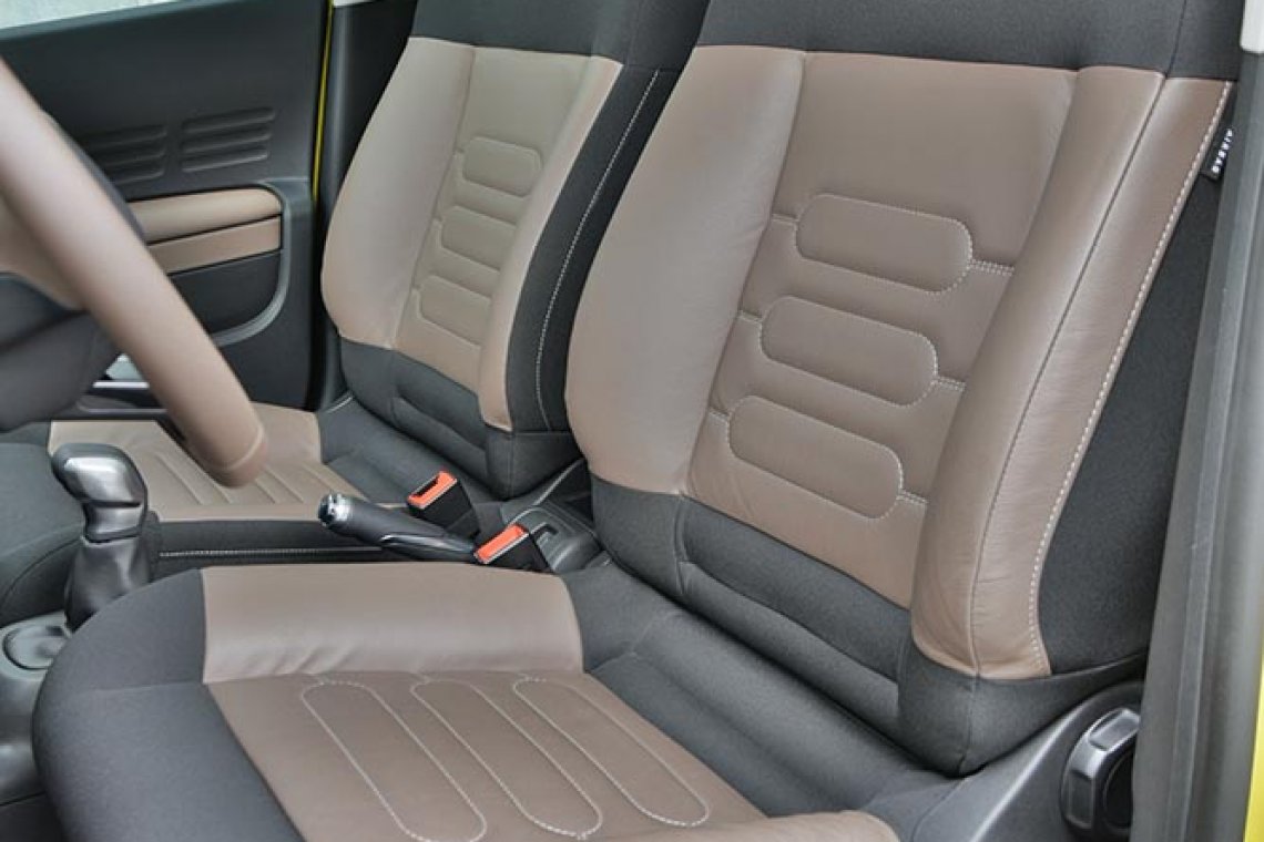 Wiele nowinek dostrzeżemy również we wnętrzu. Już klamka służąca zamykaniu drzwi przypomina rączkę eleganckiej damskiej torebki. Standardem jest 7-calowy ekran dotykowy na środkowej konsoli oraz cyfrowy zestaw zegarów za kołem kierownicy. Poprzez ekran dotykowy mamy możliwość sterowania m.in. klimatyzacją, multimediami, nawigacją czy ustawieniami telefonu. W wersjach ze sterowaną elektronicznie skrzynią biegów ETG zastąpiono tradycyjną dźwignię zmiany biegów uproszczonym systemem „Easy Push", który obejmuje konsolę z przyciskami „D, N, R" w dolnej części deski rozdzielczej i manetkę przy kierownicy do ręcznej zmiany przełożeń. Ciekawym rozwiązaniem jest podłokietnik między fotelami z przodu, który po podniesieniu do pionu stworzy nam jednolitą kanapę. Nie mniej intrygująco rozwiązano problem gdzie umieścić poduszkę powietrzną przed pasażerem. Spory schowek uniemożliwia sensowne umieszczenie airbagu. Citroën zdecydował się umieścić poduszkę powietrzną...w podsufitce dachu. W wersji z panoramicznym dachem zamontowano szybę o wysokim stopniu izolacji termicznej. Tym samym producent mógł zrezygnować z rolety i odchudzić pojazd o 25 kg. Kolejne 11 kg niższą masę uzyskano rezygnując z montażu mechanizmów podnoszenia okien w drugim rzędzie drzwi. W to miejsce zastosowano szyby uchylne, jak w modelu C1. Cactus dysponuje bagażnikiem o pojemności 358 litrów, który można powiększyć poprzez złożenie oparcia tylnej kanapy. Niestety nawet w bogatszych wersjach uzyskana powierzchnia nie jest płaska a oparcie kanapy nie jest dzielone. To rażące uproszczenie producent uzasadnia chęcią obniżenia masy (tu uzyskał 6 kg). Nas to nie przekonuje.
