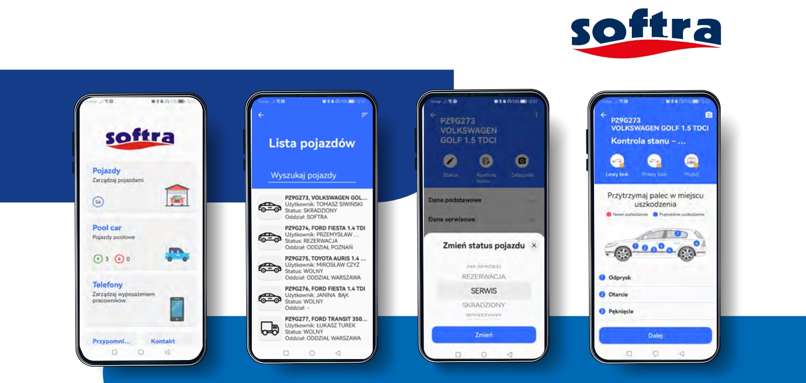 eSOFTRA jest aplikacją na urządzenia mobilne takie jak smartfon/tablet, umożliwiającą dostęp i aktualizację aktualnych danych pojazdów w systemie Flota oraz usprawniającą proces wydawania pojazdów i ocenę ich stanu. Aplikacja jest zintegrowana z systemami „Flota”. Żeby dokładnie sprawdzić działanie aplikacji, zainstalowaliśmy ją na dwóch urządzeniach – iPhonie oraz telefonie z systemem Android. Nie mamy floty obsługiwanej przez Softrę, ale na potrzeby testu zarządzaliśmy wirtualną flotą. To 53 samochody jeżdżące w trzech lokalizacjach: Warszawie, Krakowie i Poznaniu. To zarówno samochody osobowe, jak i dostawcze.