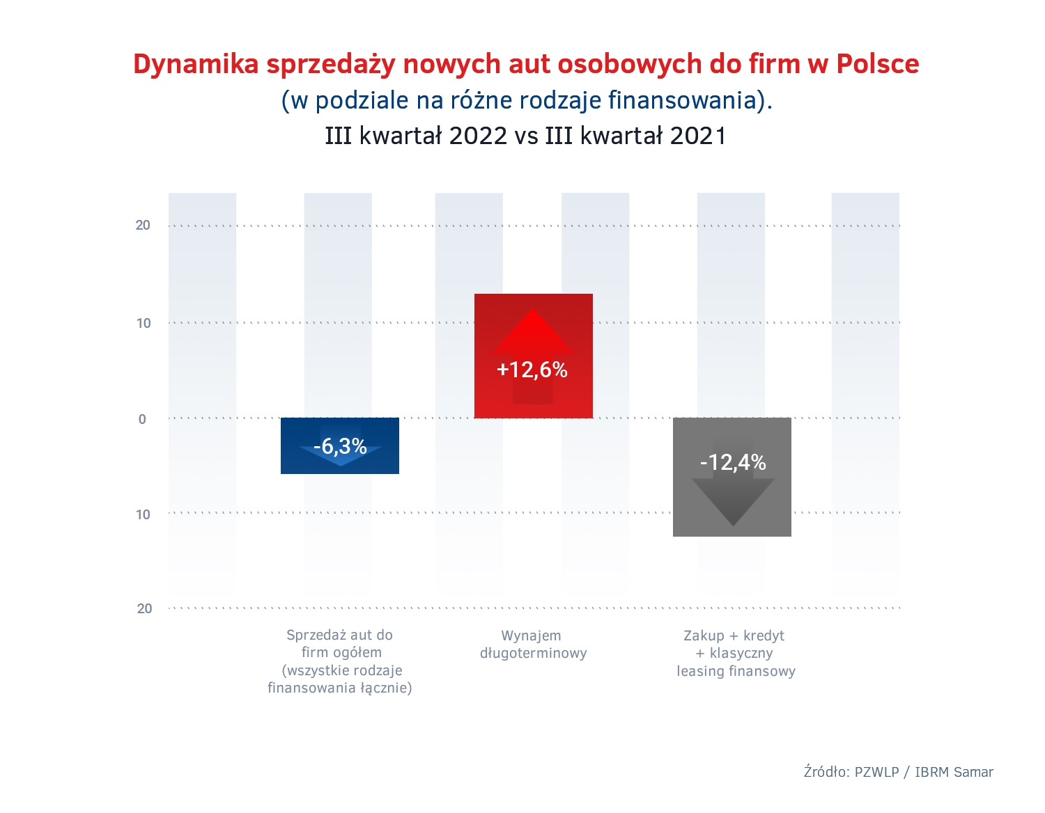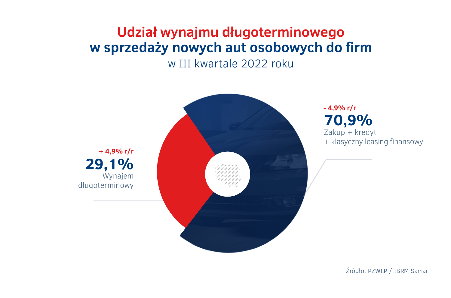 Rosnąca sprzedaż w wynajmie, przy jednoczesnych spadkach w tym zakresie w pozostałych formach finansowania, skutkowała znaczącym zwiększeniem udziału wynajmu długoterminowego w ogólnej liczbie sprzedanych w Polsce w trzecim kwartale 2022 r. samochodów osobowych. Na 73,8 tys. aut, które łącznie nabyły w tym czasie firmy, 29,1% pojazdów (21,5 tys.) znalazło się w wynajmie długoterminowym. Udział wynajmu długoterminowego w sprzedaży samochodów osobowych do firm w naszym kraju zwiększył się aż o 4,9 p.p. w ciągu roku.