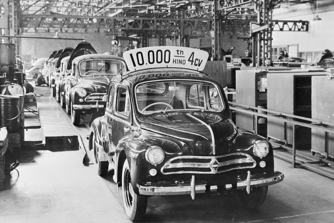 Idea masowo produkowanego „auta popularnego" była znana w Renault od połowy lat 20. W kolejnej dekadzie wprowadzono na rynek modele Celtaquatre i Juvaquatre, które stanowiły ważny etap na drodze ku masowej motoryzacji we Francji. Mimo trwającej wojny, w Billancourt podjęto kolejną próbę budowy samochodu dla mas. W maju 1941 roku inżynierowie Fernand Picard,Charles-Edmond Serre i Jean-Auguste Riolfo określili założenia projektu. Prace ruszyły jesienią następnego roku. Książę Wilhelm von Urach, główny pełnomocnik techniczny i okupacyjny zarządca w firmie Renault, znany ze swojej niechęci do nazistów, dyskretnie sprzyjał Projektowi 106. Przed wojną arystokrata pracował m.in. w firmie Bugatti w alzackim Molsheim, później przeszedł do koncernu Daimler-Benz. 4 stycznia 1943 roku pierwszy z trzech prototypów wyruszył w pierwszą podróż, a raczej test drogowy, podczas którego osiągnął prędkość 84 km/h. Auto miało silnik oraz skrzynię biegów umieszczoną z tyłu nadwozia o aerodynamicznym kształcie. Poszycie karoserii wykonano z blachy aluminiowej, gdyż stal była wówczas ściśle racjonowanym materiałem strategicznym. Czterocylindrowy, chłodzony cieczą silnik Type 662/1 o pojemności 760 cm3 współpracował z 3-biegową skrzynią i napędzał koła tylnej osi. Konstruktorzy zdecydowali się na zastosowanie niezależnego zawieszenia ze sprężynami śrubowymi i hydraulicznymi amortyzatorami Allinquant. W latach 1944-45 zbudowano kolejne dwa prototypy. Do produkcji skierowano wersję z 4-drzwiowym nadwoziem. Auto mieściło 4 osoby i niewielki bagaż. Podczas testów osiągnięto prędkość 90 km/h i średnie zużycie paliwa ok. 7 l/100 km. Stojący na czele Renault Pierre Lefaucheux nadał projektowi rangę priorytetu. Konstrukcję auta maksymalnie uproszczono. W stanie gotowym do jazdy ważyło 600 kg. W przedseryjnych egzemplarzach szybyw tylnych drzwiach były nieruchome, a z tyłu montowano tylko jedną lampę. Pierwsze powojenne lata były wyjątkowo trudnym okresem w historii Renault. Trwała odbudowa zniszczonych w 1944 roku hal produkcyjnych. Brakowało materiałów i przy budowie nadwozi aluminium zastąpiono stalą. Niedobór lakierów spowodował, że pierwsze egzemplarze malowano piaskową, półmatową farbą Crème 314 z zapasów pozostawionych przez Wehrmacht. Auto zyskało więc nieoficjalny, lecz bardzo popularny przydomek motte de beurre (osełka masła). Wczesne egzemplarze wyróżniały się ponadto lakierowanymi na czerwono obręczami kół. Lefaucheux zaproponował, by nowe Renault otrzymało nazwę Régiquatre, nawiązującą do przedwojennych modeli. Padły też inne propozycje nazw jak Régine lub Réginette. Po konsultacjach z załogą wybrano jednak nazwę 4 CV, która określała liczbę tzw. koni podatkowych (1 CV - ok. 190 cm3). Oficjalna premiera Renault Type 1060 odbyła się 3 października 1946 roku podczas 33. edycji Salon de l'Automobile w Paryżu. Frekwencja pierwszego po wojnie salonu była niezwykła: w ciągu kilku dni ekspozycje w Grand Palais odwiedziło 809 tys. osób. To właśnie Renault 4 CV było główną atrakcją salonu i wzbudzało większe emocje niż ekskluzywne Delage D6 czy wyścigowe Bugatti Type 59/50DB. Francuzi z utęsknieniem oczekiwali „auta masowego". Bardziej niż nowych samochodów osobowych rząd Republiki oczekiwał od Renault tysięcy aut dostawczych, ciężarówek i autobusów niezbędnych w trudnym, powojennym okresie. Wielu decydentów wątpiło w siłę nabywczą francuskiego społeczeństwa. Mimo wolnorynkowej gospodarki firmy z branży motoryzacyjnej borykały się z niedoborem stali, szkła, mas plastycznych oraz innych surowców. Od czerwca do grudnia 1946 roku zbudowano zaledwie 36 aut z tzw. serii zerowej. Seryjną produkcję 4 CV rozpoczęto dopiero 12 sierpnia 1947 roku w zakładzie Billancourt. Około 300 egzemplarzy trafiło do dealerów Renault na terenie całej Francji. Produkcja rozkręcała się powoli: dziennie produkowano tylko 15 aut. Lefaucheux wyznaczył ambitny cel - 300 samochodów dziennie, który osiągnięto po 2 latach. Pierwsi klienci wysoko oceniali nowe auto. W krótkim (3,6 m) nadwoziu było wystarczająco dużo miejsca dla całej rodziny. Czynności obsługowe uproszczono: olej silnikowy należało zmieniać co 2,5 tys., a czyszczenie filtra powietrza benzyną – co 10 tys. kilometrów. Nowością roku 1948 była użytkowa wersja Commerciale (kod fabryczny R2070) z zaślepionymi szybami tylnych drzwi i tylko dwoma siedzeniami. Oprócz poniemieckiego lakieru Crème oferowano szary Gris RAF, kojarzący się z mundurami brytyjskich lotników. Rok później samochody oferowano także w kolorze czarnym, zielonym oraz dwóch odcieniach koloru niebieskiego. Ówczesna cena w zależności od wyposażenia wynosiła od 280 do 310 tys. franków. Pod koniec dekady Renault 4 CV były dostępne w wersjach Luxe i Grande Luxe. Hasło promujące auto brzmiało 4 miejsca, 4 cylindry, 90 km/h i 6 litrów na 100 km, a kilka lat później, gdy na skutek inflacji cena wzrosła, zmieniono je na 4 CV, 4 drzwi i 444 tys. franków. Wersja Luxe wyróżniała się kołem kierownicy z białego tworzywa i „kłami" na zderzakach. Od października 1950 roku Renault 4 CV Grand Luxe było napędzane silnikiem o mocy 21 KM. Prędkość maksymalna wzrosła do 100 km/h. Topowa wersja wyróżniała się chromowanymi listwami i białymi ozdobnymi pasami na bokach opon. Na zamówienie klientów Renault oferowało wersję Decapotable – kabriolet ze zwijanym dachem lub stalowym odsuwanym dachem. Montowano ją w paryskiej firmie karoseryjnej S.A.P.R.A.R. W 1950 roku zmniejszono pojemność skokową silnika z 760 do 748 cm3. Zmodyfikowano przód nadwozia i kształt zderzaków. Warto dodać, że pod koniec lat 40. Renault 4 CV odnosiło liczne sukcesy sportowe. 30 stycznia 1949 roku Louis i Jean-Louis Rosier zwyciężyli w swojej klasie w Rajdzie Monte Carlo. Później nastąpiło