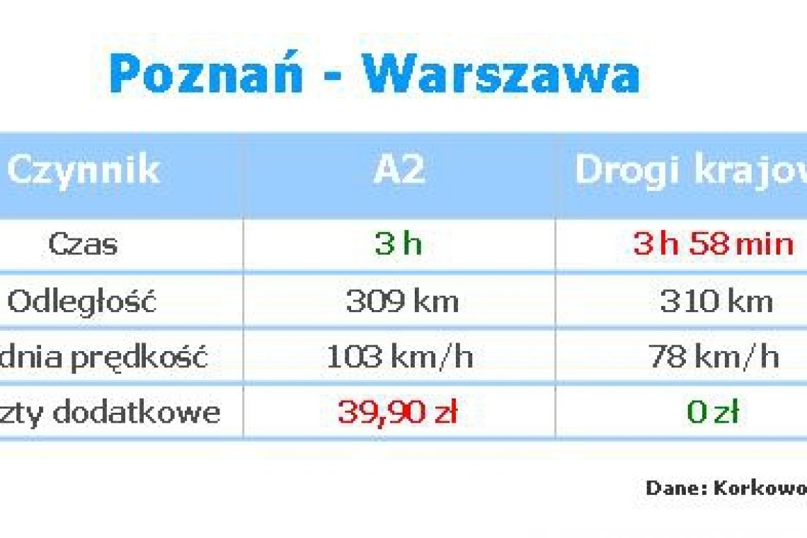 Czy korzystanie z autostrad jest zawsze bardziej opłacalne od korzystania z dróg krajowych? To pytanie zadaje sobie niejeden kierowca planujący trasę. Specjaliści z serwisu Korkowo.pl sprawdzili to na przykładzie A2. Autostrada A2 biegnie równoleżnikowo przez centralne tereny kraju i docelowo ma połączyć wschód i zachód Polski. Na niektórych jej odcinkach kierowcy muszą pokrywać koszty przejazdu, co podnosi wydatki przeznaczane na podróż. Korzystanie z dróg krajowych jest bezpłatne, ale na ogół wiąże się z dłuższym pobytem za kółkiem. Specjaliści z serwisu Korkowo.pl postanowili przekonać się, jak duże bywają te różnice. – Porównaliśmy dwie trasy łączące Poznań z Warszawą. Jedna z nich biegła przez autostradę A2 druga przez drogi krajowe – mówi Katarzyna Florkowska z serwisu Korkowo.pl. – Jak się okazało przejazd z wykorzystaniem autostrady trwa o 25 % krócej, jednak za taką przyjemność trzeba sporo zapłacić – dodaje Florkowska. Szybko, bo płatnie?Kierowcy, którzy zmierzają do stolicy drogami krajowymi spędzą za kółkiem prawie 4 godziny pokonując w tym czasie około 310 kilometrów. Nie będą jednak ponosić kosztów korzystania z tychże dróg. Jeżeli zmotoryzowani zdecydują się na przejazd autostradą A2, to odcinek 309 kilometrów pokonają tylko w 3 godziny. Korzystanie z A2 oznacza jednak konieczność uiszczenia opłat. Odcinek A2 z Poznania do Konina należy do „Autostrady Wielkopolskiej", a przejazd nim kosztuje obecnie 30 złotych. Następnym płatnym odcinkiem na trasie jest fragment A2 łączący Konin ze Strykowem pod Łodzią. Ten odcinek zarządzany jest przez GDDiKA a korzystanie z niego jest nieco tańsze i wynosi niecałe 10 złotych. Przejazd ze Strykowa do Warszawy jest póki co wolny od opłat. W sumie przejazd z Poznania do Warszawy autostradą będzie kosztował kierowców dodatkowe 40 zł. Dane o sytuacji drogowej zostały opracowane przez serwis Korkowo.pl, który prezentuje aktualne informacje o korkach na polskich drogach. Analizie poddano dane GPS z urządzeń Yanosik oraz Flotis Mobile umieszczonych w pojazdach poruszających się po badanych trasach w dniach 1-12 października 2013. Źródło: Creandi.pl