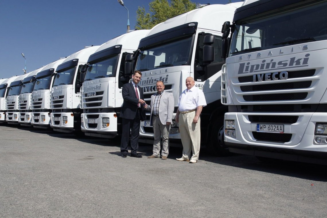 Kolejny sukces Iveco Poland. Pod koniec maja br. dobyło sie przekazanie duzej partii pojazdów dla jednego z najwiekszych przedsiebiorstw transportowych z rejonu Polski Centralnej z Sierpca. Firma Transport-Spedycja Lipinski posiada dodatkowo własny magazyn logistyczny w Szczecinie oraz realizuje m.in. w usługi przewozowe dla firmy Carlsberg. Jak wiadomo w okresie letnim transport musi byc niezawodny i szybko realizowac dostawy napojów. Dwadziescia zakupionych EcoStralisów dołaczy teraz do floty pozostałych pojazdów z logo Lipinski i z powodzeniem ruszy do pracy. Na przełomie roku Iveco Poland udostepniło pojazd demonstracyjny EcoStralis (460 KM) do testów firmie Lipinski. Wynik zuzycia paliwa, bezawaryjnosc oraz wysoki komfort pracy pozytywnie zaskoczył włascicieli firmy, którzy wczesniej nie mieli do czynienia z EcoStralisem. Firma realizuje transporty krajowe i miedzynarodowe wozac rózne rodzaje ładunków. IVECO Stralis miał wiec mozliwosc wykazac sie swoimi najlepszymi zaletami – wygodna przestronna kabina, mocnym dynamicznym silnikiem i doskonałymi własciwosciami trakcyjnymi. - Mamy duze doswiadczenie w transporcie samochodowym i pojazdach ciezarowych. Na przestrzeni kilkudziesieciu lat mielismy mozliwosc uzytkowania wielu marek samochodów. EcoStralis, który zima przechodził testy w naszej firmie miło nas zaskoczył i dlatego kolejne nasze samochody to własnie ta marka – mówi Adam Lipinski własciciel przedsiebiorstwa. Bardzo cieszymy sie, z faktu, ze firma Transport-Spedycja Lipinski wybrała nas, jako partnerów biznesowych. Nasze pojazdy z pewnoscia zasługuja na wyróznienie i dlatego jezdza u najlepszych – powiedział Przemysław Górski, Direct Sales Manager Iveco Poland. Firma Lipinski, która zakupiła dwadziescia ciagników siodłowych IVECO Stralis w wersji Eco dba o komfort pracy swoich kierowców. Pojazdy w wysokiej kabinie Active Space sa wyposazone w dwie wygodne lezanki, pneumatyczne fotele (fotel kierowcy jest ogrzewany), zintegrowane pasy bezwładnosciowe i zagłówki, niezalezne ogrzewanie kabiny, lodówke, tempomat, elektryczne szyby, elektrycznie ustawiane i podgrzewane lusterka wsteczne, lusterko rampowe, komputer pokładowy z funkcjami wyswietlanymi w jezyku polskim, fabryczne radio z odtwarzaczem CD, centralny zamek, dodatkowe swiatła przeciwmgielne i dalekosiezne. W słoneczne upalne dni dodatkowy komfort daja przyciemniane szyby oraz automatyczna klimatyzacja. Kabina sypialna zawieszona na czterech poduszkach powietrznych jest wykonana z blach dwustronnie ocynkowanych poddanych kataforezie - co w warunkach zimowych skutecznie chroni pojazd przed korozja.