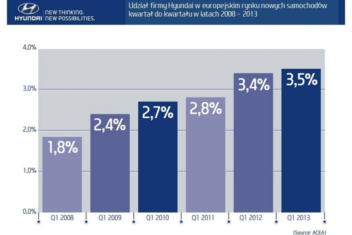 Nowe dane Europejskiego Stowarzyszenia Producentów Pojazdów ACEA, dotyczące wolumenu rejestracji nowych samochodów pokazują, że udział w rynku europejskim firmy Hyundai w pierwszym kwartale 2013 roku wyniósł 3,5%. Wynik ten oznacza wzrost o 0,1% w porównaniu z analogicznym okresem ubiegłego roku. Podczas gdy liczba rejestracji nowych samochodów na europejskim rynku motoryzacyjnym spadła w ciągu trzech miesięcy o 9,7%, poziom rejestracji samochodów marki Hyundai zmniejszył się o 4,7% i wyniósł 109 693 sztuk. „Trudna sytuacja rynkowa sprawiła, że wyniki sprzedaży w pierwszym kwartale tego roku są niższe od oczekiwanych. Według nas, ten trend utrzyma się także w drugim kwartale, ale wierzymy, że drugiej połowie roku klienci będą z większą pewnością i odwagą podejmować decyzje zakupowe" – powiedział Allan Rushforth, wiceprezes i dyrektor operacyjny Hyundai Motor Europe. "Nie ma firmy, która pozostałaby obojętna wobec dzisiejszej sytuacji gospodarczej, dlatego cieszymy się, że w pierwszych trzech miesiącach 2013 roku utrzymaliśmy udział w rynku. Oczywiście przewidujemy możliwość fluktuacji w ciągu roku, ale naszym głównym celem jest zachowanie wyniku na poziomie 3,5%" – dodaje Rushforth. Hyundai zbudował swoją reputację w oparciu o nowoczesny design, zaawansowane technologie oraz zlokalizowanie produkcji samochodów w Europie. Dzięki temu jest w stanie odpowiedzieć na zapotrzebowania klientów, oczekujących ciekawych projektów, jakości, niskiego zużycia paliwa oraz innych cech wpływających na ogólną satysfakcję z użytkowanego samochodu.Jednym z ostatnich modeli opracowanych z myślą o rynkach europejskich jest nowy ix35, zaprezentowany podczas tegorocznych targów w Genewie. W drugiej odsłonie najlepiej sprzedającego się SUV-a Hyundaia ulepszono napęd oraz zwiększono wydajność. Zaprojektowany, opracowany i wyprodukowany w Europie ix35 to najnowszy model wprowadzony na rynek zgodnie ze strategią Hyundaia, zakładającą produkcję samochodów dedykowanych klientom konkretnego regionu. Źródło : Hyundai