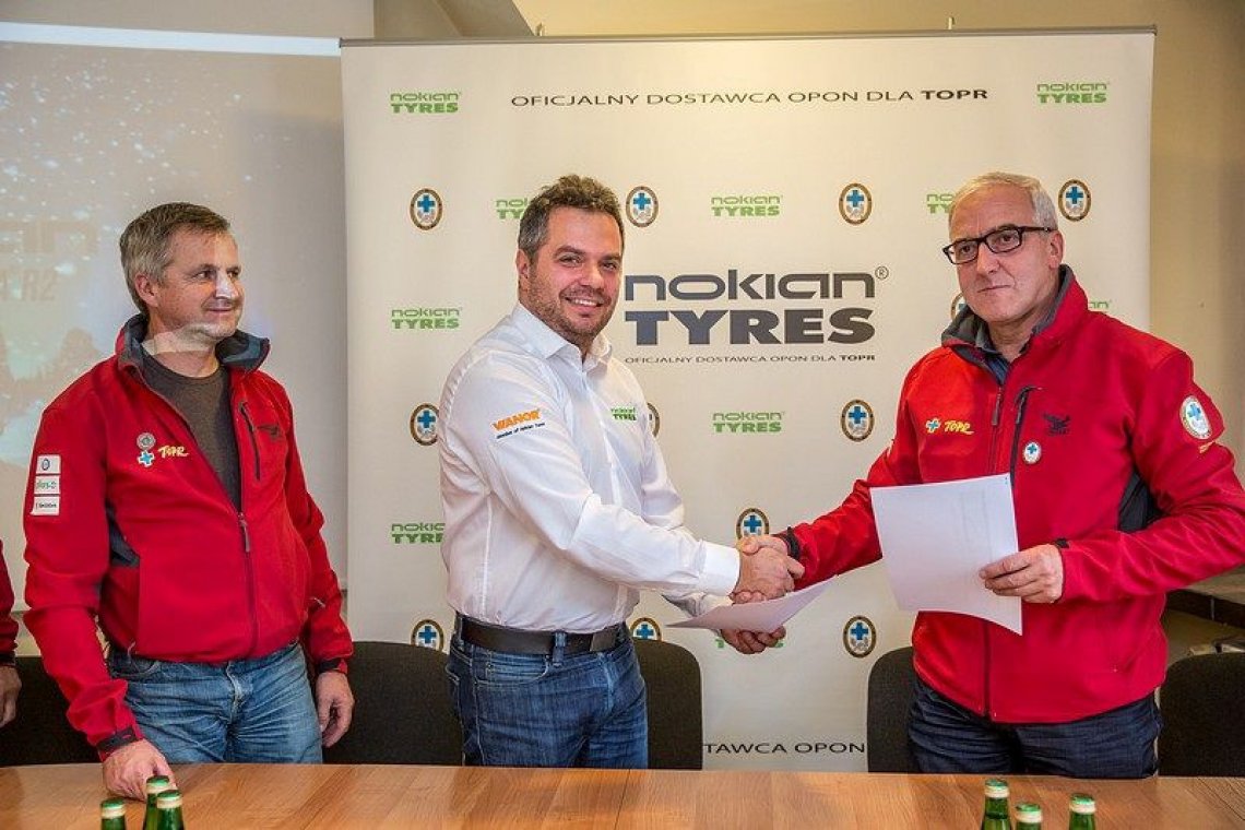 Tatrzańskie Ochotnicze Pogotowie Ratunkowe podpisało dziś umowę z fińskim producentem opon Nokian Tyres. Finowie będą dostarczać opony do wszystkich znajdujących się we flocie TOPR samochodów. Od dziś TOPR będzie jeździć na zimowym oraz letnim ogumieniu firmy Nokian. W siedzibie TOPR w Zakopanem naczelnik tatrzańskiego pogotowia ratunkowego Jan Krzysztof oraz przedstawiciel Nokian Tyres Polska Michał Antoszkiewicz, podpisali dziś umowę o współpracy. Nokian będzie dostarczać na potrzeby TOPR opony letnie oraz zimowe o łącznej wartości ponad 150 tysięcy złotych. –„Cieszymy się, iż Nokian Tyres zostało oficjalnym dostawcą opon dla TOPR. Praca ratowników górskich jest niezwykle ważna. Spoczywa na nas wielka odpowiedzialność, sprzęt na którym pracujemy, musi być niezawodny. Dlatego też Nokian Tyres specjalizujący się w produkcji opon przeznaczonych do trudnych warunków pogodowych jest idealnym partnerem dla TOPR." – tłumaczy Michał Antoszkiewicz przedstawiciel Nokian w Polsce.