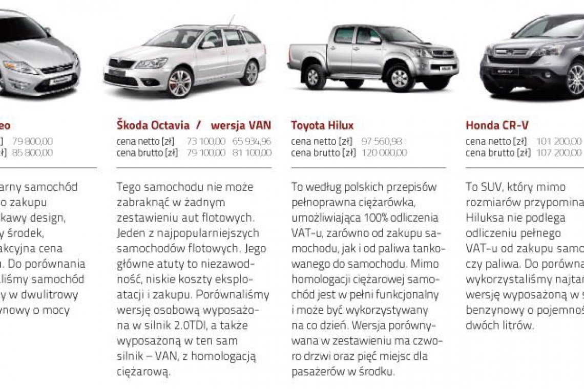Do końca 2010 roku przy zakupie nowego samochodu przedsiębiorca mógł odliczyć pełną stawkę VAT. Wtedy też polski przemysł zaliczył jeden z najwyższych wzrostów sprzedaży nowych samochodów osobowych. Po 1 stycznia 2011 możliwe jest odliczenie maksymalnie 6000 zł VAT. Od osobówki nie odliczymy także VAT od paliwa. To znacznie zwiększa koszty funkcjonowania floty samochodowej. W 2011 roku z kolei znacznie wzrosła sprzedaż samochodów ciężarowych. Piotr Tabor Ford Mondeocena netto [zł] 79 800,00 cena brutto [zł] 85 800,00 Dość popularny samochód we flocie. Do zakupu zachęca ciekawy design, komfortowy środek, a także atrakcyjna cena samochodu. Do porównania wykorzystaliśmy samochód wyposażony w dwulitrowy silnik benzynowy o mocy 145 KM. ŠkodaOctavia / wersja VANcena netto [zł] 73 100,00 brutto [zł] 79 100,00 ŠkodaOctavia VAN65 934,96 cena brutto [zł] 81 100,00 Tego samochodu nie może zabraknąć w żadnym zestawieniu aut flotowych. Jeden z najpopularniejszych samochodów flotowych. Jego główne atuty to niezawodność, niskie koszty eksploatacji i zakupu. Porównaliśmy wersję osobową wyposażona w silnik 2.0TDI, a także wyposażoną w ten sam silnik – VAN, z homologacją ciężarową. Toyota Hiluxcena netto [zł] 97 560,98 cena brutto [zł] 120 000,00 To według polskich przepisów pełnoprawna ciężarówka, umożliwiająca 100% odliczenia VAT-u, zarówno od zakupu samochodu, jak i od paliwa tankowanego do samochodu. Mimo homologacji ciężarowej samochód jest w pełni funkcjonalny i może być wykorzystywany na co dzień. Wersja porównywana w zestawieniu ma czworo drzwi oraz pięć miejsc dla pasażerów w środku. Honda CR-Vcena netto [zł] 101 200,00 cena brutto [zł] 107 200,00 To SUV, który mimo rozmiarów przypominających Hiluksa nie podlega odliczeniu pełnego VAT-u od zakupu samochodu czy paliwa. Do porównania wykorzystaliśmy najtańszą wersję wyposażoną w silnik benzynowy o pojemności dwóch litrów. Odliczenie VAT-u skłania coraz więcej przedsiębiorstw do tego, by kupić samochody z homologacją ciężarową, nawet jeśli ich do końca nie potrzebują. Trudno się temu dziwić, potencjalne korzyści z odliczenia pełnego VAT-u od zakupu paliwa i samochodu to łakomy kąsek dla firmy. Trzeba jednak pamiętać, że zakaz odliczenia podatku VAT od samochodów osobowych wprowadzony jest tylko czasowo i początkowo miał być zniesiony z końcem 2012 roku. Niestety, nowy projekt Ministerstwa Finansów przedłuża ten zakaz o kolejny rok, czyli VAT od samochodów osobowych będziemy mogli odliczać od 1 stycznia 2014 roku. Postanowiliśmy sprawdzić, jak możliwość odliczenia podatku VAT od paliwa, a także zakupu samochodu, wpływa na całkowity koszt eksploatacji samochodu w firmie. Czy lepiej kupić droższego pikapa z możliwością odliczenia VAT, czy też tańszy, ekonomiczniejszy samochód osobowy bez możliwości odliczenia podatku? Jest to, oczywiście, obrazowe, uproszczone i schematyczne działanie, ale pozwalające pokazać efekt skali i nieprzystosowanie naszych przepisów do potrzeb rynku. Do porównania wykorzystaliśmy jedne z najbardziej popularnych samochodów użytkowanych w firmach. Dla wszystkich samochodów przyjęliśmy czas użytkowania trzy lata, a średni roczny przebieg na poziomie 30 tys. km. Jak wspomniałem wyżej, od samochodów osobowych możemy odliczyć tylko 60% VAT, nie więcej jednak niż 6000 zł. Droższa Toyota Hilux dla prywatnej osoby, dla przedsiębiorcy już na starcie jest tańsza o blisko 8000 zł. Również zwiększony koszt zakupu ŠkodyOctavii Van (która droższa jest od zwykłej wersji o 2000 zł) szybko się zwraca. Octavia Van w cenie netto jest tańsza o ponad 7000 zł (czyli blisko 10% wartości całego samochodu! – patrz Tabela 1.). Analiza kosztów paliwa również pokazuje, jak dużą cześć ceny za paliwo pochłania podatek VAT. Wydawałoby się, że kupno samochodu z homologacją ciężarową dla przedsiębiorstwa to po prostu konieczność. O ile różnica w kosztach używania Toyoty Hilux i Hondy CRX w kwotach brutto jest prawie niezauważalna (200 zł rocznie), jeśli popatrzymy na kwoty netto, to okaże się, że Hilux każdego roku zaoszczędził dla nas ponad 3000 zł! Niemniej jednak, by mieć pełny obraz tego, czy faktycznie opłaca się kupić samochód z homologacją ciężarową, warto zsumować całościowo koszty zakupu samochodu, paliwa i sprawdzić, nie tylko ile VAT zaoszczędzimy, ale także ile pieniędzy z budżetu firmy faktycznie wydamy – Tabela 2. Najtańszym autem w zestawieniu, mimo nie najmniejszej ceny zakupu, okazała się ŠkodaOctavia w wersji Van, co nie może być dla nikogo zaskoczeniem. Oszczędny silnik wysokoprężny, homologacja na samochód ciężarowy i relatywnie niska cena zakupu to główne czynniki sukcesu. W porównaniu do osobowej wersji samochód w ogólnym rozrachunku po trzech latach okazał się być tańszy o około 13 000 zł. Niestety, nie ma nic za darmo. Octavia Van zmieści tylko dwie osoby, a poziom komfortu w całym samochodzie jest znacznie niższy niż w wersji osobowej, nie wspominając o jej znacznie mniejszej funkcjonalności. Toyota Hilux również okazała się tańsza od Hondy CR-V o blisko 10 000 zł. Odliczenie VAT od paliwa i zakupu samochodu bardzo się opłaca i to fakt niepodważalny, ale też nie możemy przeceniać tego aspektu podczas wyboru samochodu do floty. Jeśli potrzebujemy komfortowej limuzyny, jaką jest bez wątpienia Ford Mondeo, kupno na siłę droższego pikapa tylko po to, by odliczać VAT, nie jest uzasadnione ekonomicznie. Mimo odliczenia VAT koszty eksploatacji pikapa są znacznie wyższe niż limuzyny klasy średniej, zupełnie odwrotnie do poziomu komfortu, którym Mondeo bije pikapy na głowę. Jeśli jednak rozważamy zakup do firmy SUV-a, warto jest rozważyć zakup samochodu z homologacją ciężarową. Mimo wyższej ceny zakupu i kosztów eksploatacji, możliwoś