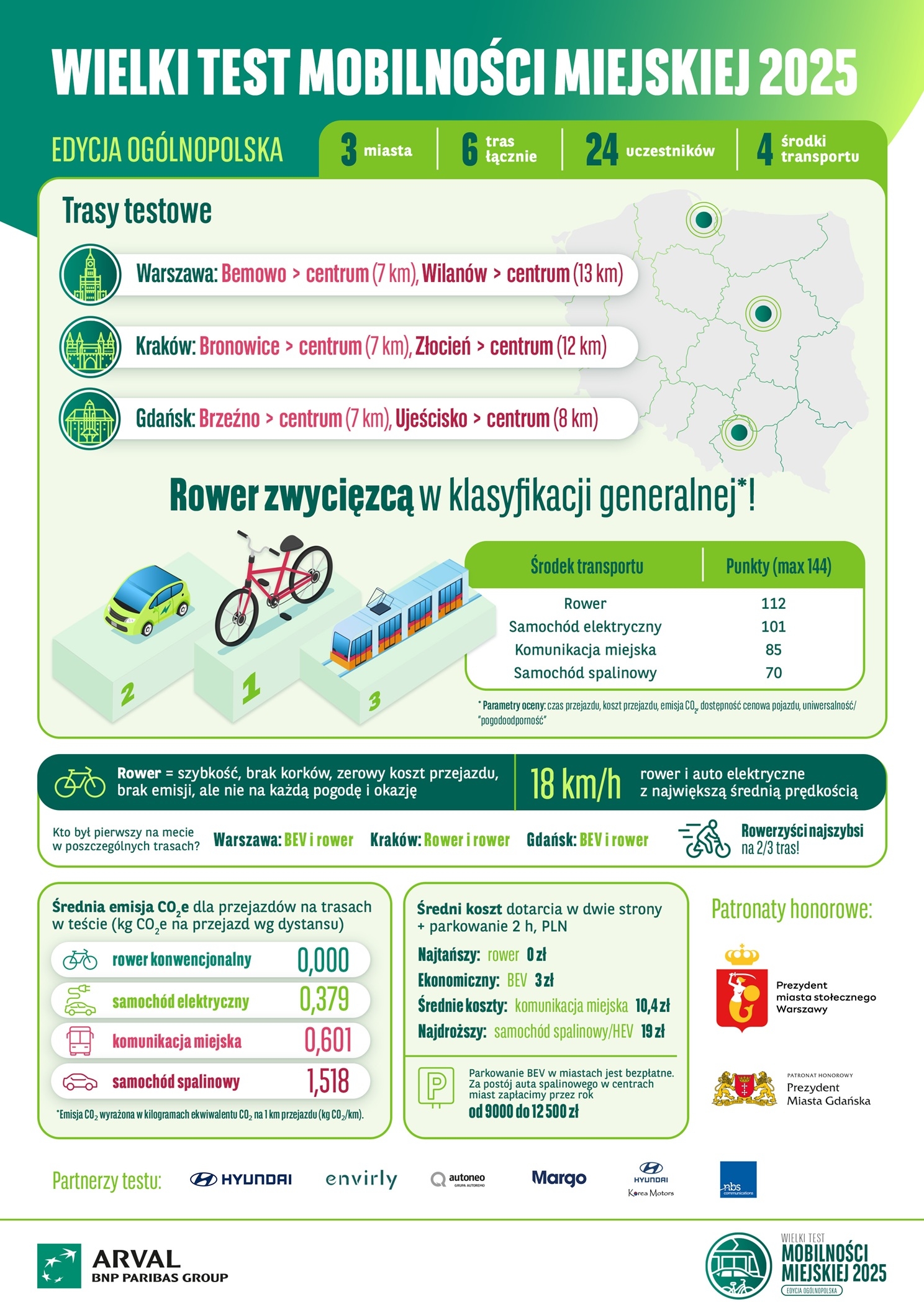 Wyniki testu potwierdziły przewagę zrównoważonych środków mobilności w miejskim środowisku. Najbardziej efektywnymi środkami transportu w każdym z trzech miast okazały się rowery, które wyprzedziły samochody pod względem czasu dojazdu, kosztów oraz wpływu na środowisko. Najlepiej jednoślady spisały się w Krakowie – mimo niesprzyjającej pogody, to właśnie tu rowerzysta jadący z Bronowic ukończył test w najkrótszym czasie z wszystkich trzech miast, a na drugiej krakowskiej trasie również najszybciej dotarła rowerzystka. W Gdańsku i Warszawie jednoślady dominowały pod względem czasu dojazdu na połowie tras.